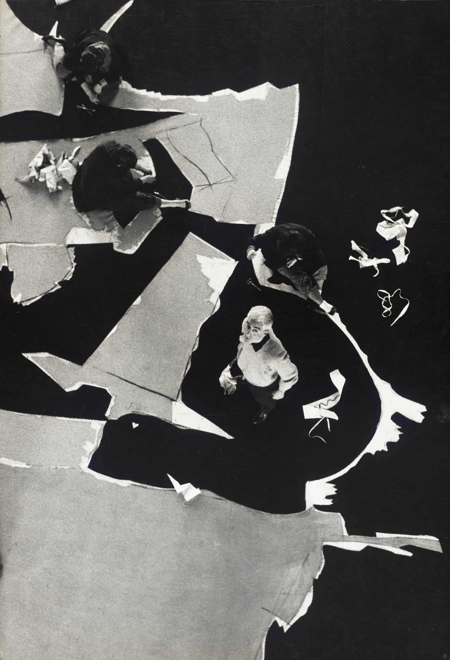 High-contrast black and white photograph shot from directly overhead, four figures in dark clothing amid large torn paper sheets on a black floor