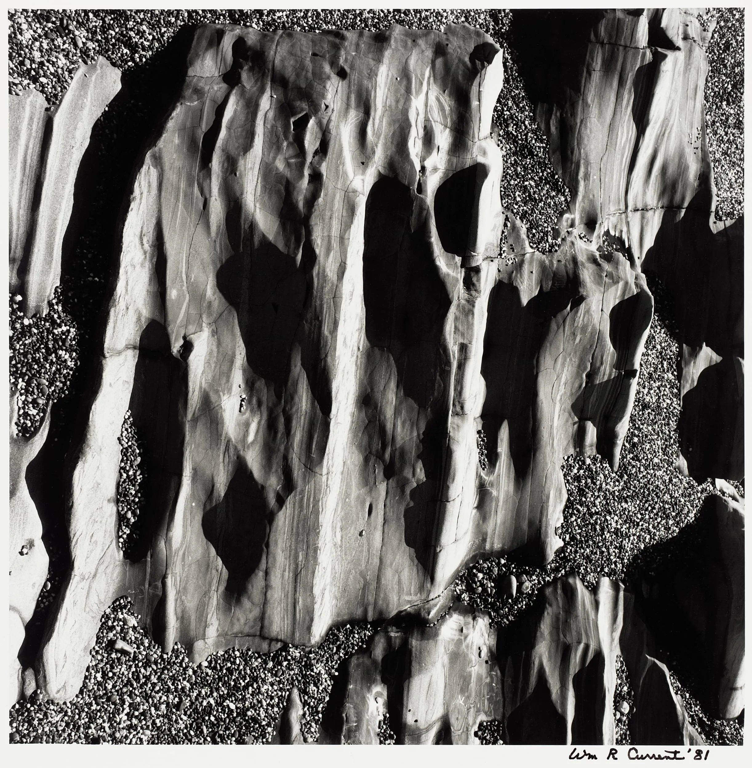 Black and white photograph looking down onto a weathered wood slab with deeply grooved vertical grain, surrounded by fine gravel, signed 'Wm. R. Current '81'