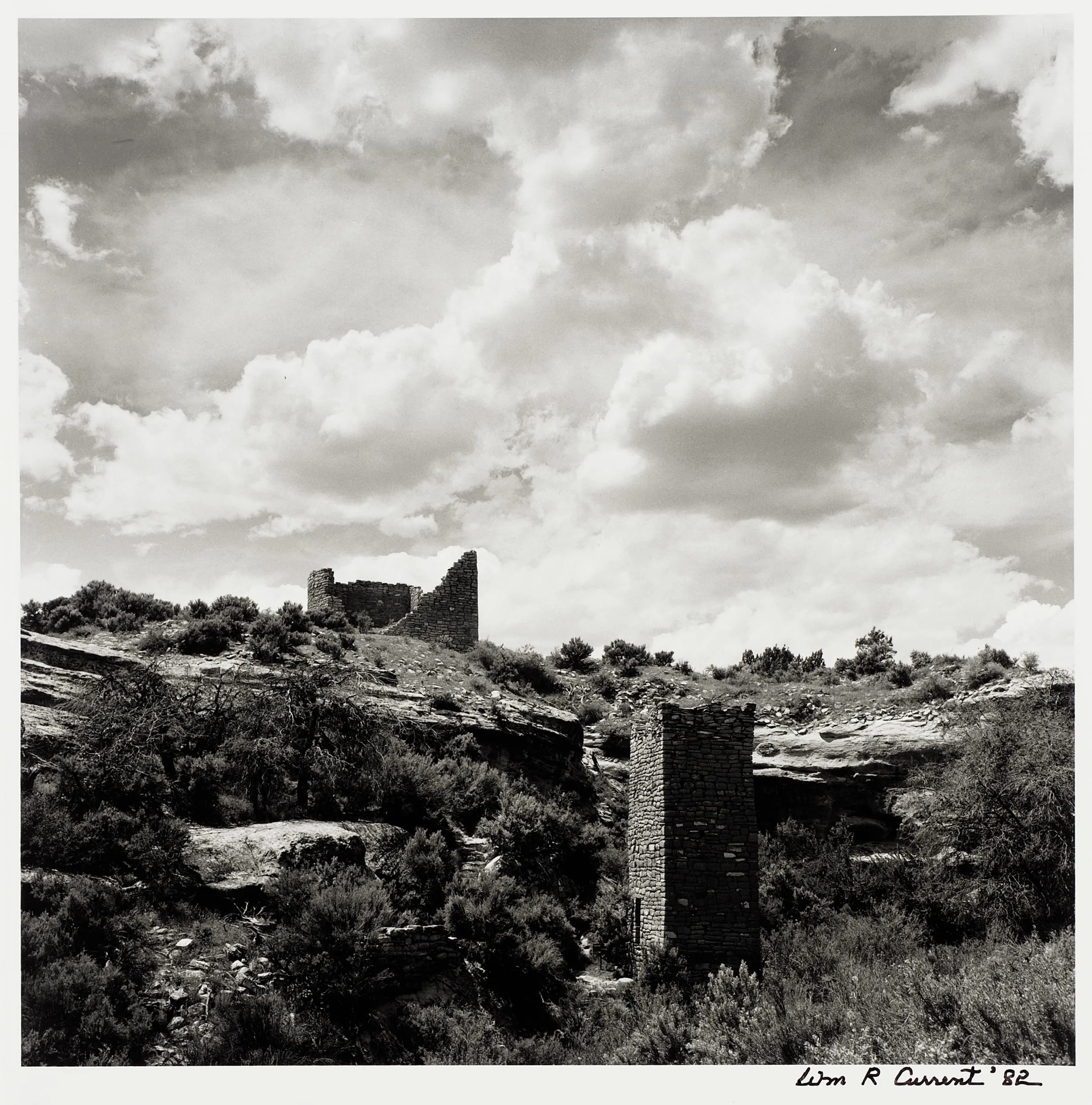 Black and white photograph of two groups of ancient stone ruins rising above scrubby desert brush and rocky terrain, under a sky of large cumulus clouds, signed and dated 1982
