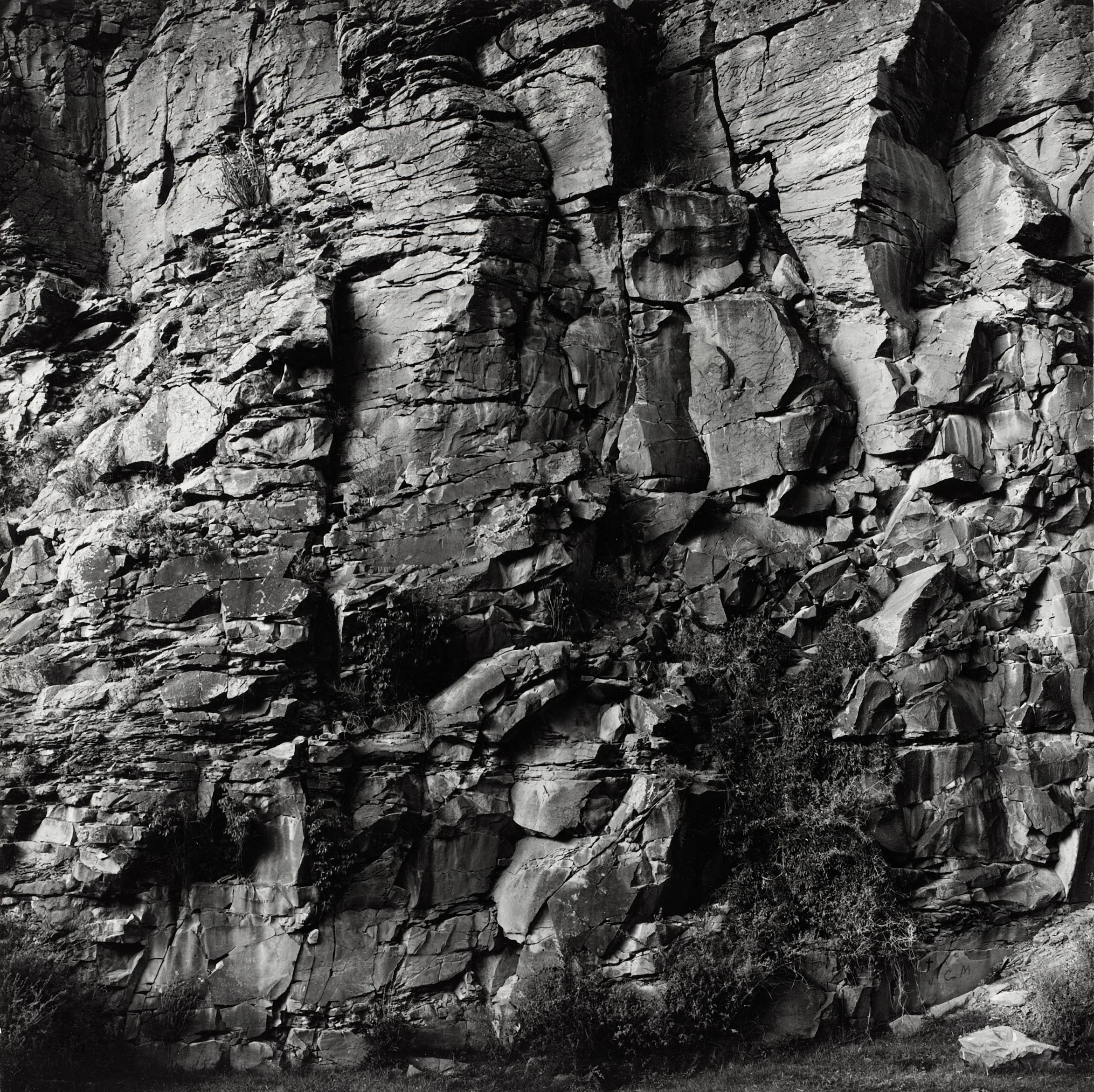 Square black and white photograph of a stratified rock cliff face filling the entire frame, with high-contrast lighting revealing layered stone, deep vertical fissures, and small dark shrubs clinging to ledges