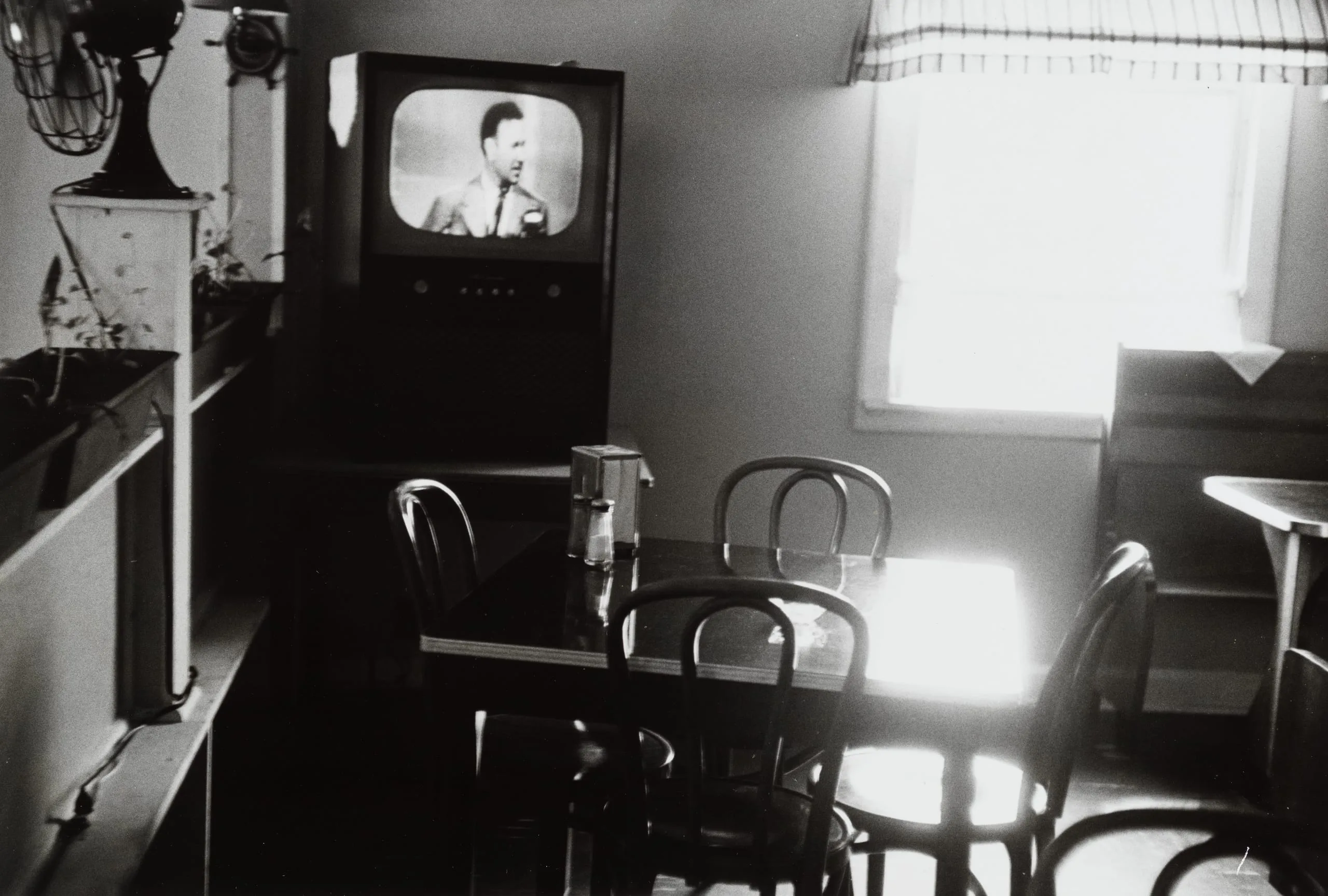 Robert Frank frames a portion of a restaurant, empty of customers, with an image from the television frozen in time. The uneven tilt of the camera creates a sense of restlessness, as if the photographer could not stay long enough to frame this scene carefully. The fleeting subject of the photograph is in competition with the radiant natural light glaring upon the tabletop, which overwhelms the new, artificial radiance of the television screen.