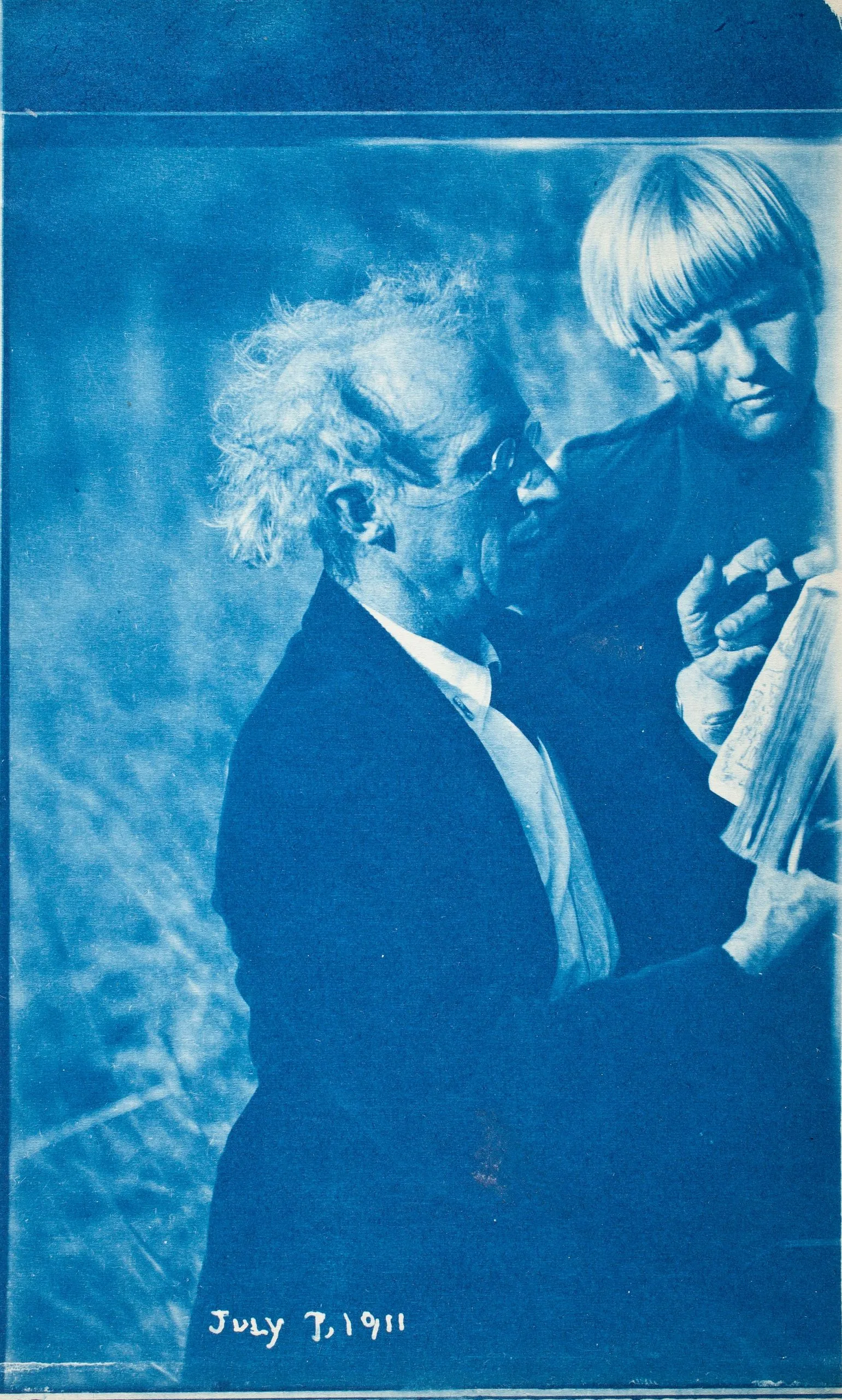 Cyanotype photograph of an elderly man with wire-rimmed glasses and wild white hair examining something in his hands, a light-haired child leaning over his shoulder, dated July 7, 1911
