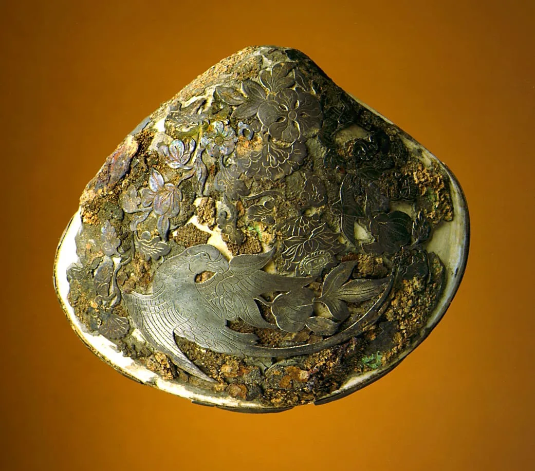 - Clamshell with lacquered fabric and cut, hammered, and incised silver sheet inlay