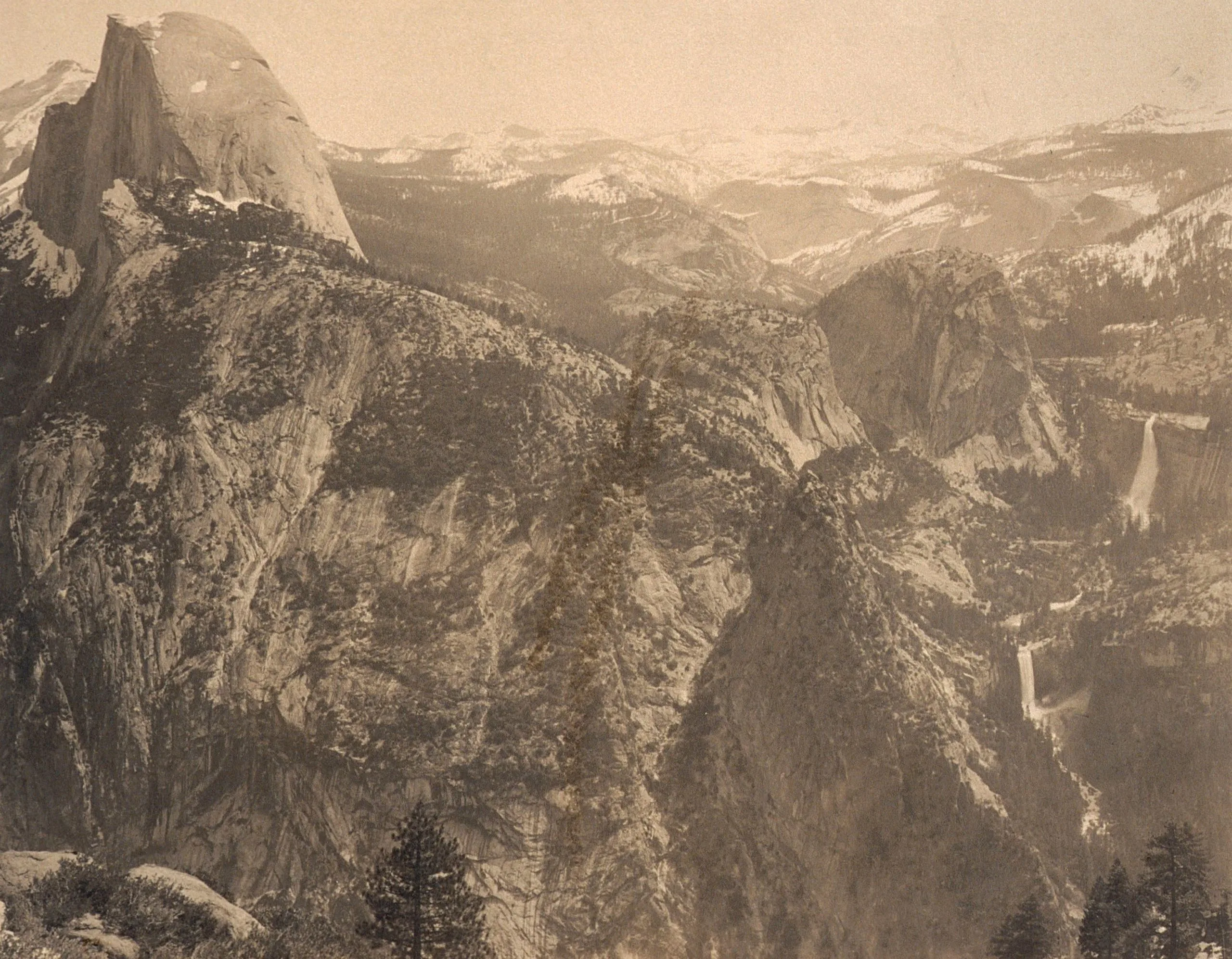 Sepia-toned photograph of a granite dome and deep valley with twin waterfalls, sweeping mountain ranges in the distance