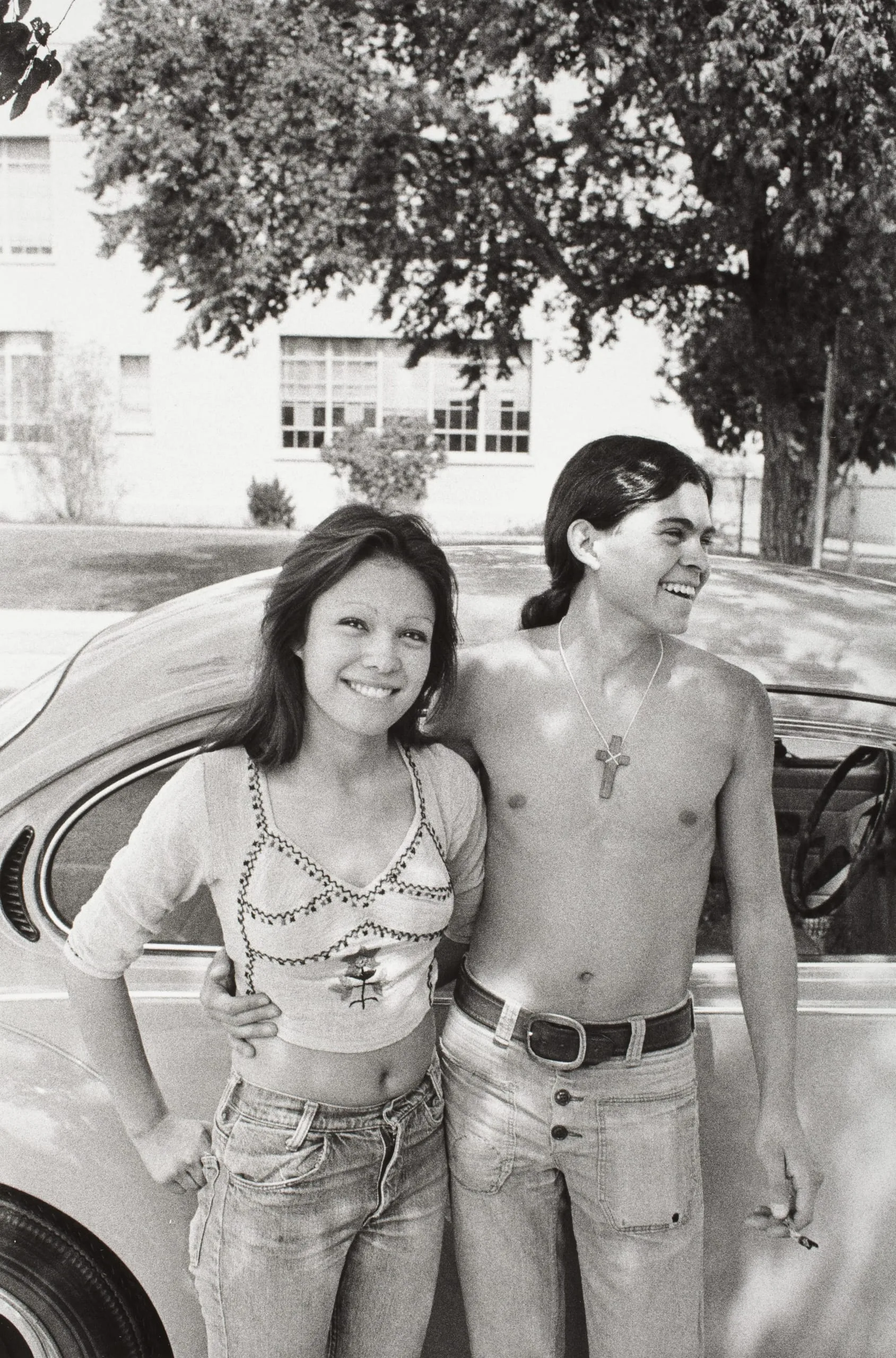 Black and white photograph of two young people laughing and standing together in front of a Volkswagen Beetle, outdoors in soft natural light