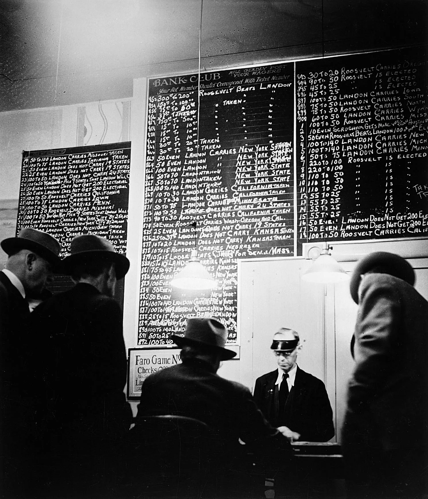 Gutmann always provided captions for his photojournalism assignments and carried this practice over to his own work. Black Jack at Reno at Election Time, depicting players as intent as stockbrokers before the chalkboard roster of odds, becomes a more potent image when the ordinary yet insular activity of gambling is juxtaposed with the auspicious event of an election.