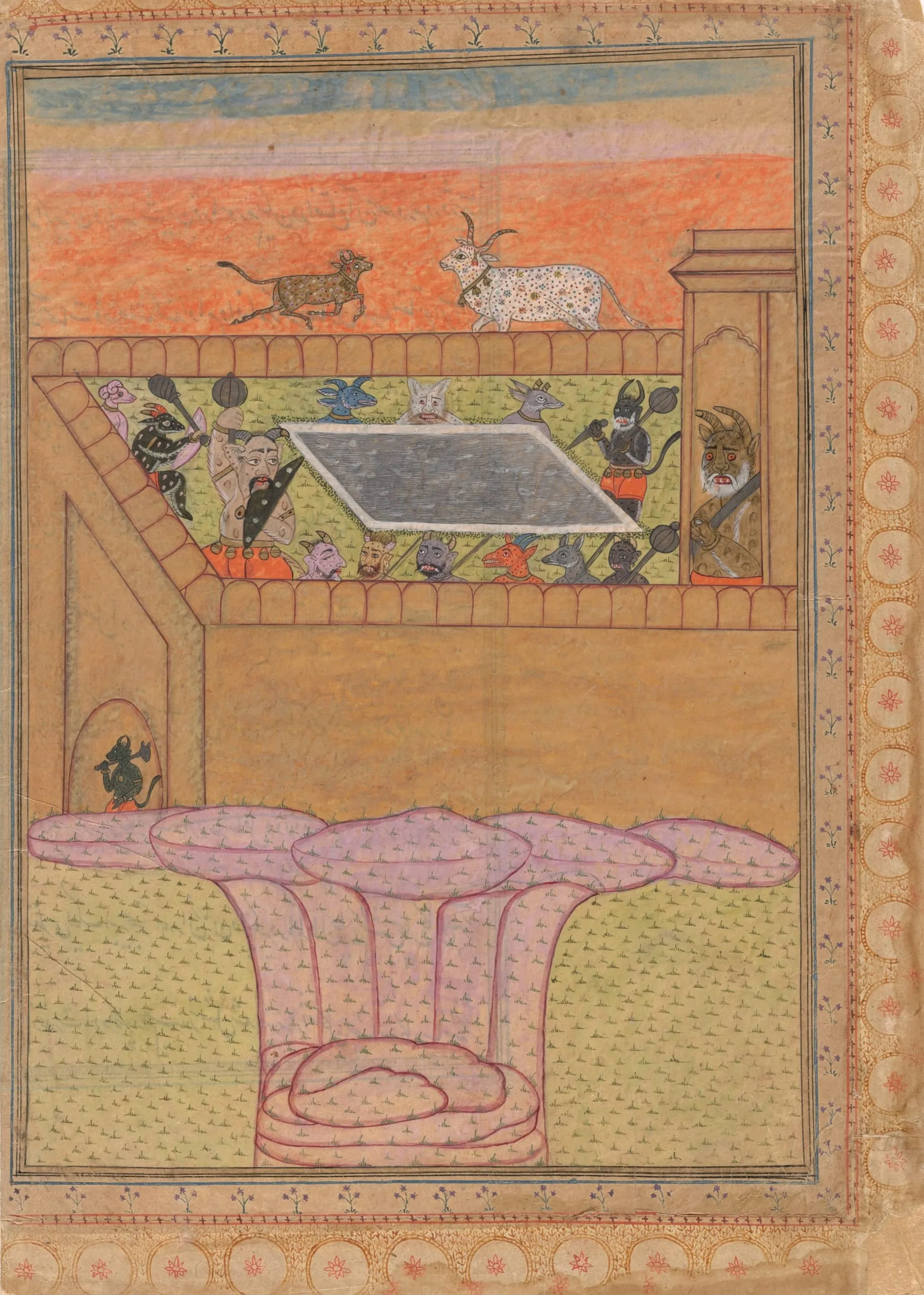This album folio is from a Persian translation of the Bhagavata Purana (Ancient Stories of the Lord). Another folio from this dispersed manuscript may be in the National Museum, New Delhi (71.130). Although the verso’s exact scene has not been identified, its imagery of a fort with a water tank and cattle generally accords with the descriptions in the nastaliq Persian text on the recto. The folio has margins with flowering plants and a border of floral medallions.