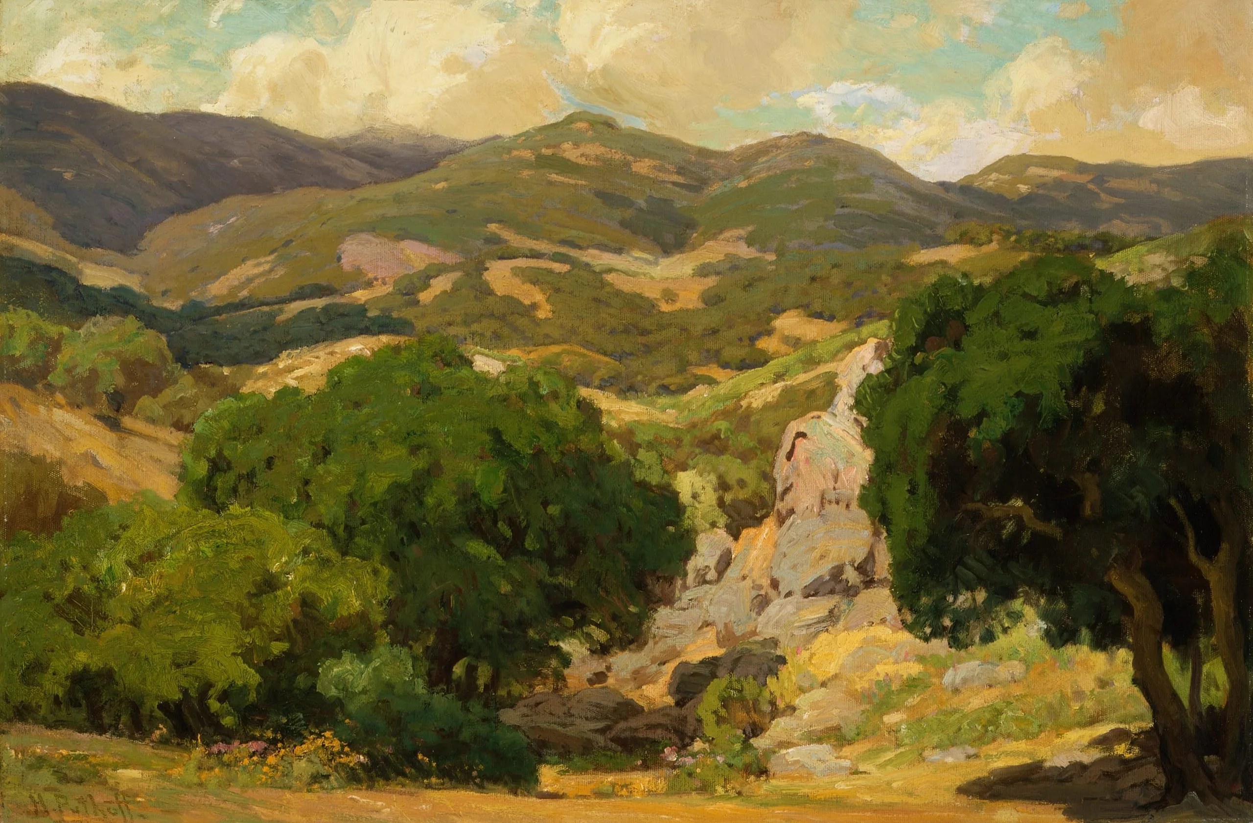 In this early canvas Puthuff accurately caught the spirit of the gently rolling coastal mountains. After settling in California, Puthuff fell in love with the openness and freedom of such hills. The landscape is a classic example of the eucalyptus school, with its emphasis on the empty, sun-filled hills of Southern California. When this painting was exhibited at a group show during the early years of the new Los Angeles Museum, the Los Angeles Times critic Antony Anderson praised Puthuff for capturing "the lovely golden brown of Southern California’s hills in summer." This palette of soft golds, ochers, and greens as well as the fluid brushwork are characteristic of the lyrical style for which Puthuff was known. The landscape may have been titled Summer Morning at some time.