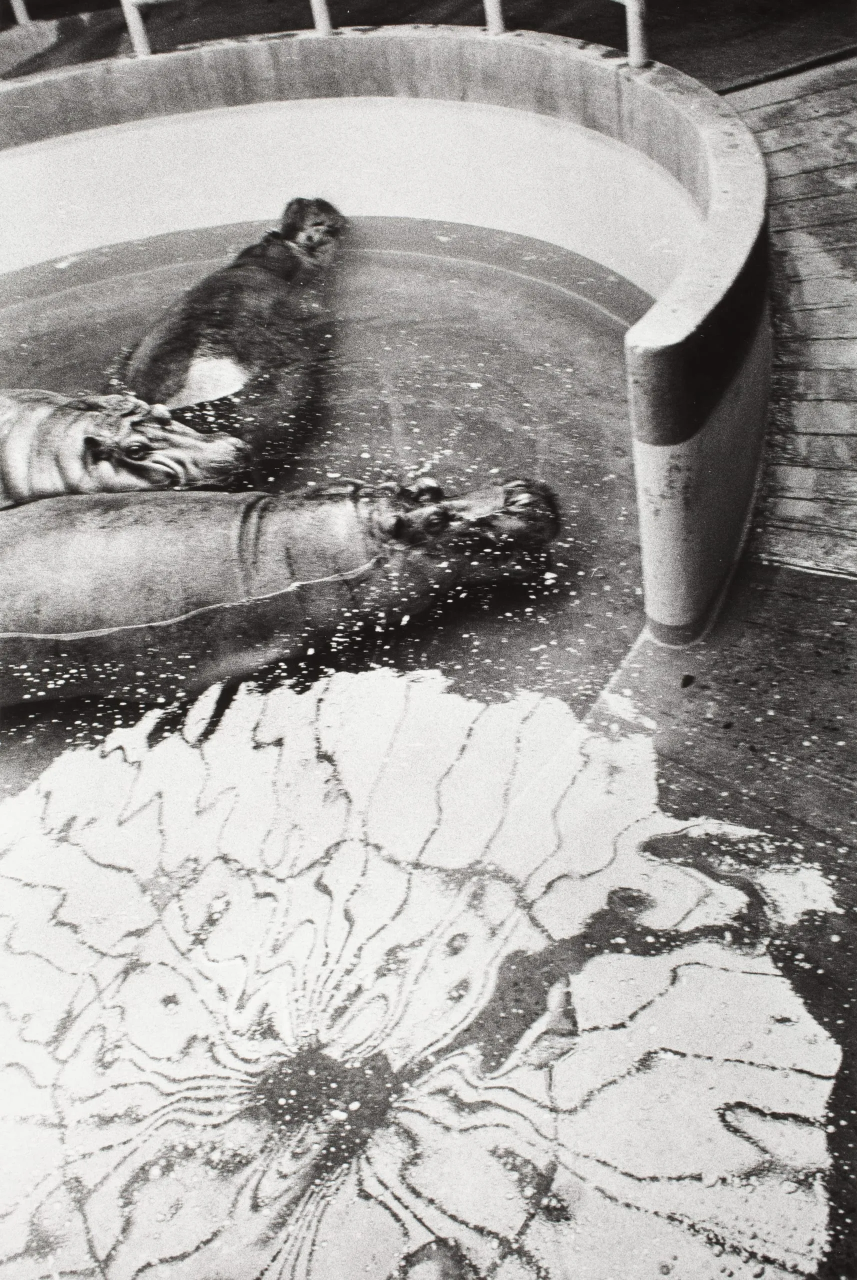 Black and white photograph looking steeply down into a circular pool with two hippopotamuses partially submerged, surrounded by swirling reflected light on the water's surface