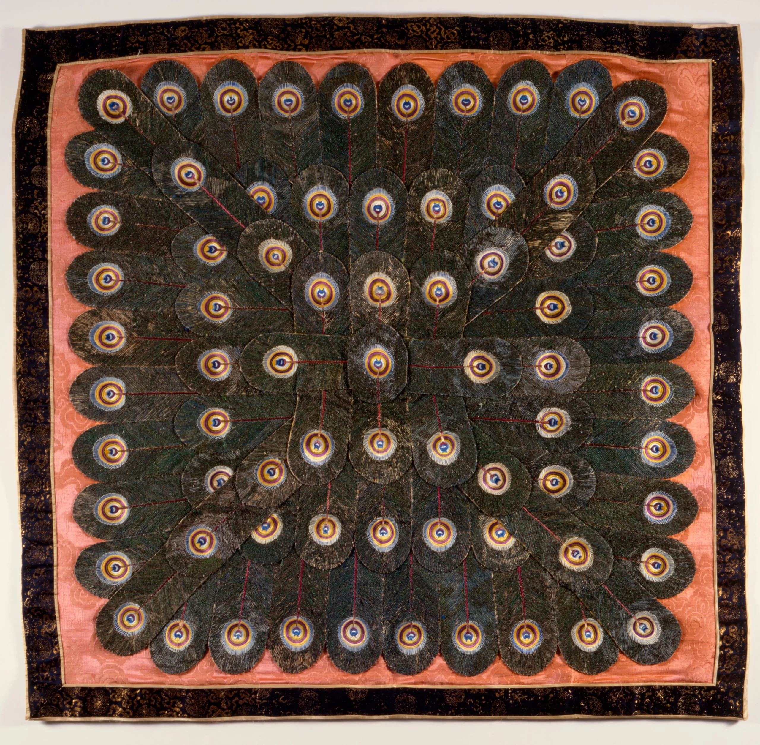 - Silk, metallic and peacock feather filament-wrapped threads; embroidery and appliqué, satin-weave damask, and supplementary weft on satin-weave ground