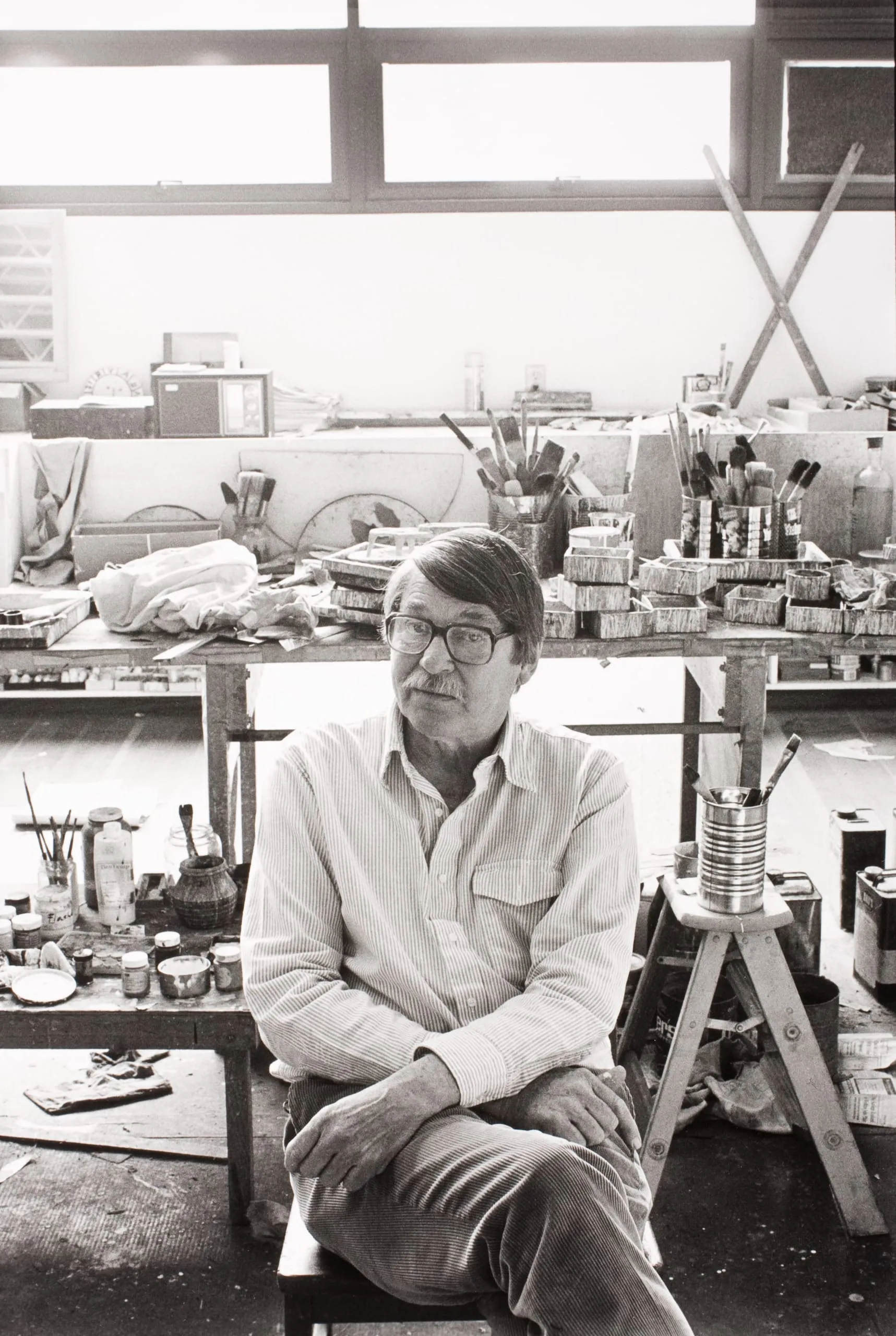 Black and white photograph, white man with eyeglasses seated with arms crossed in a paint-supply-filled artist's studio, lit by bright windows behind him