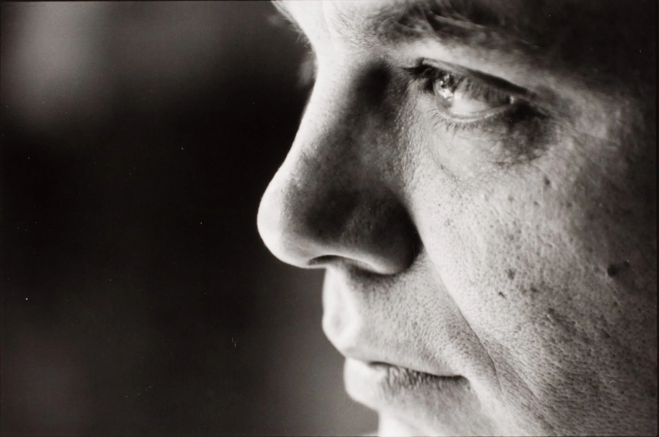Close-up black and white portrait photograph of a man's face in near-profile, strongly lit from the right with deep shadow on the left