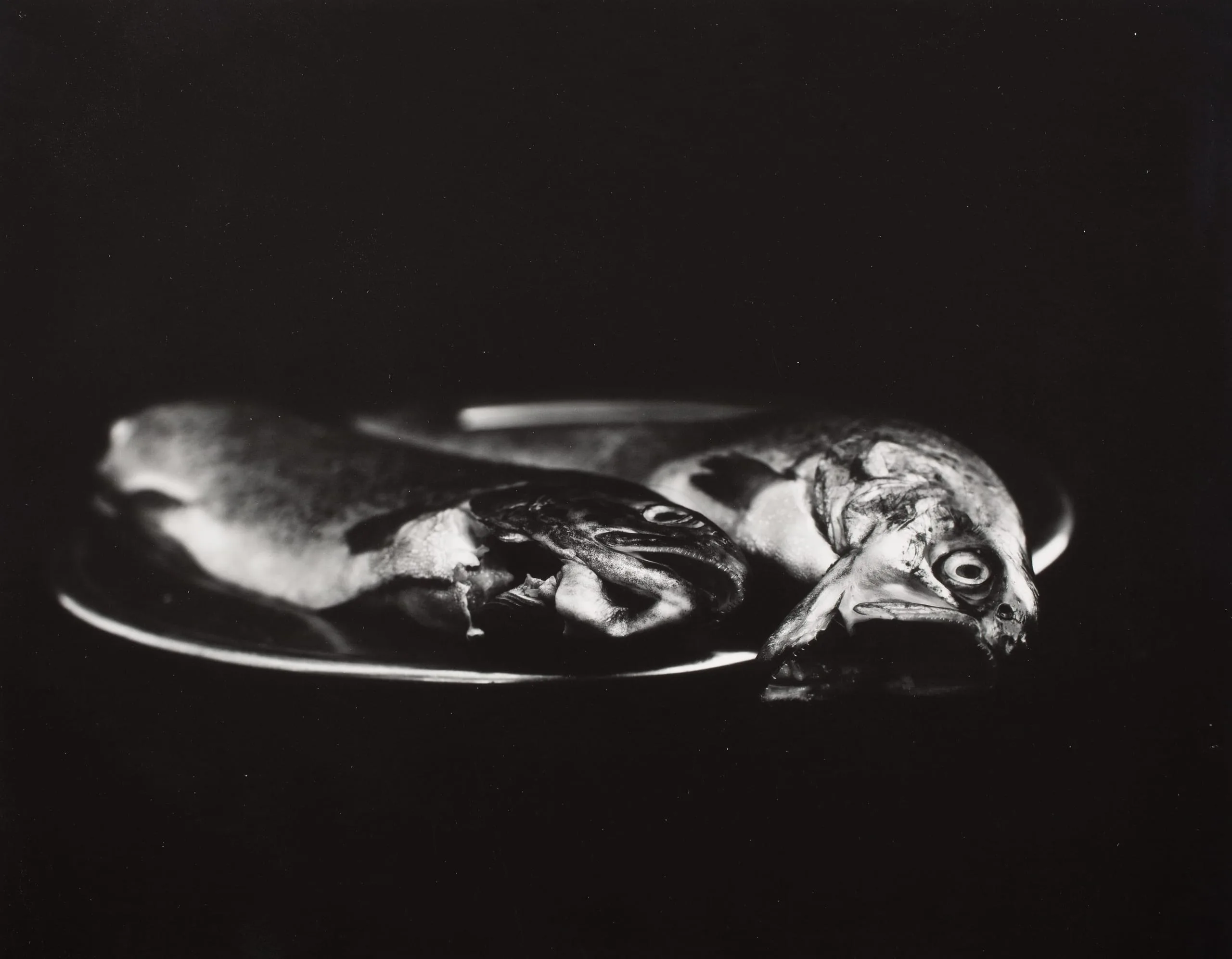 Black and white photograph of two whole fish with open mouths on a round plate, lit dramatically from the upper left against a black background