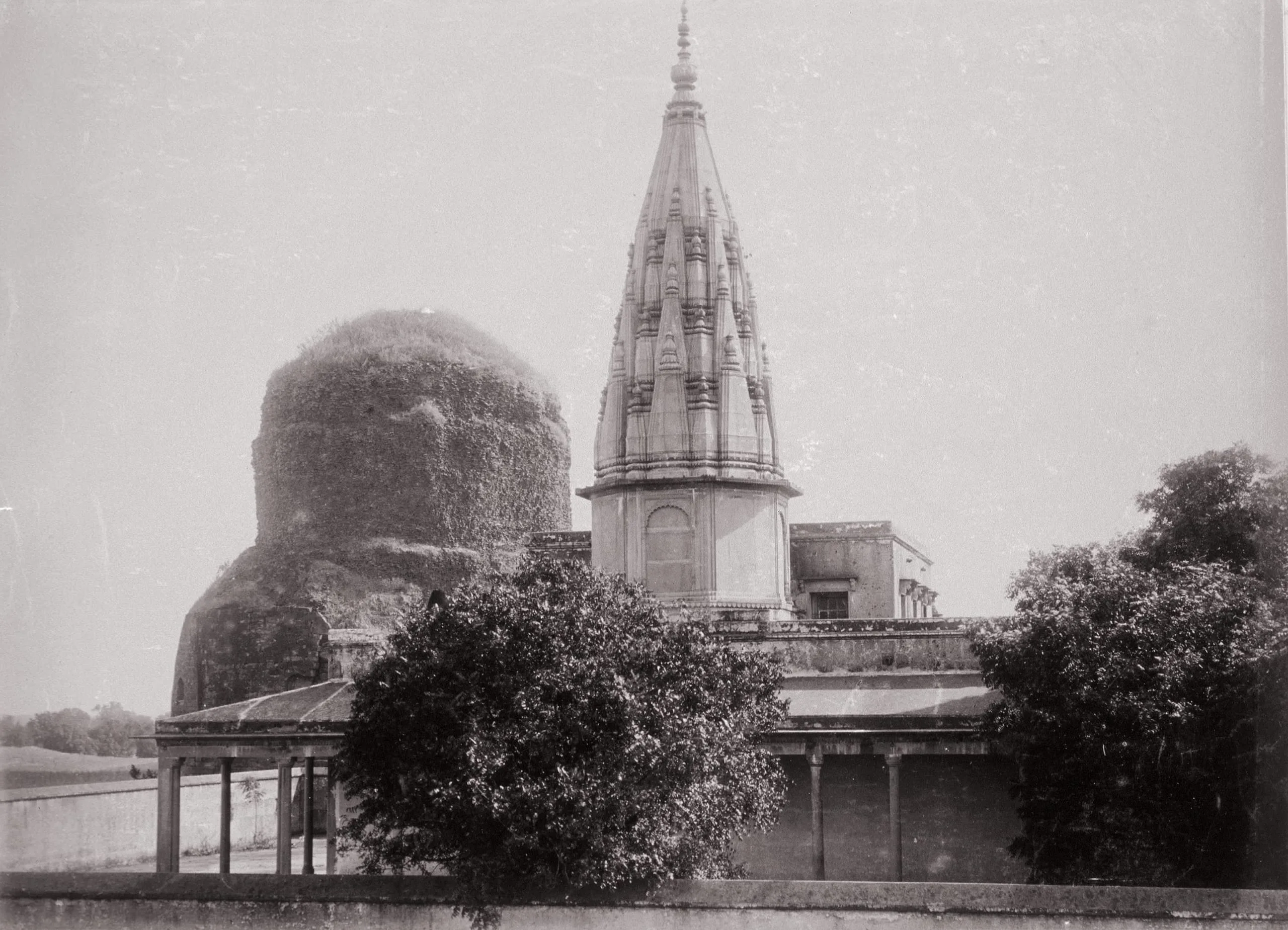 - View of Sarnath Jain Tirth [aka Shreyanshnath Jain Temple, built in 1824] in the foreground and Dhamek Stupa at Sarnath