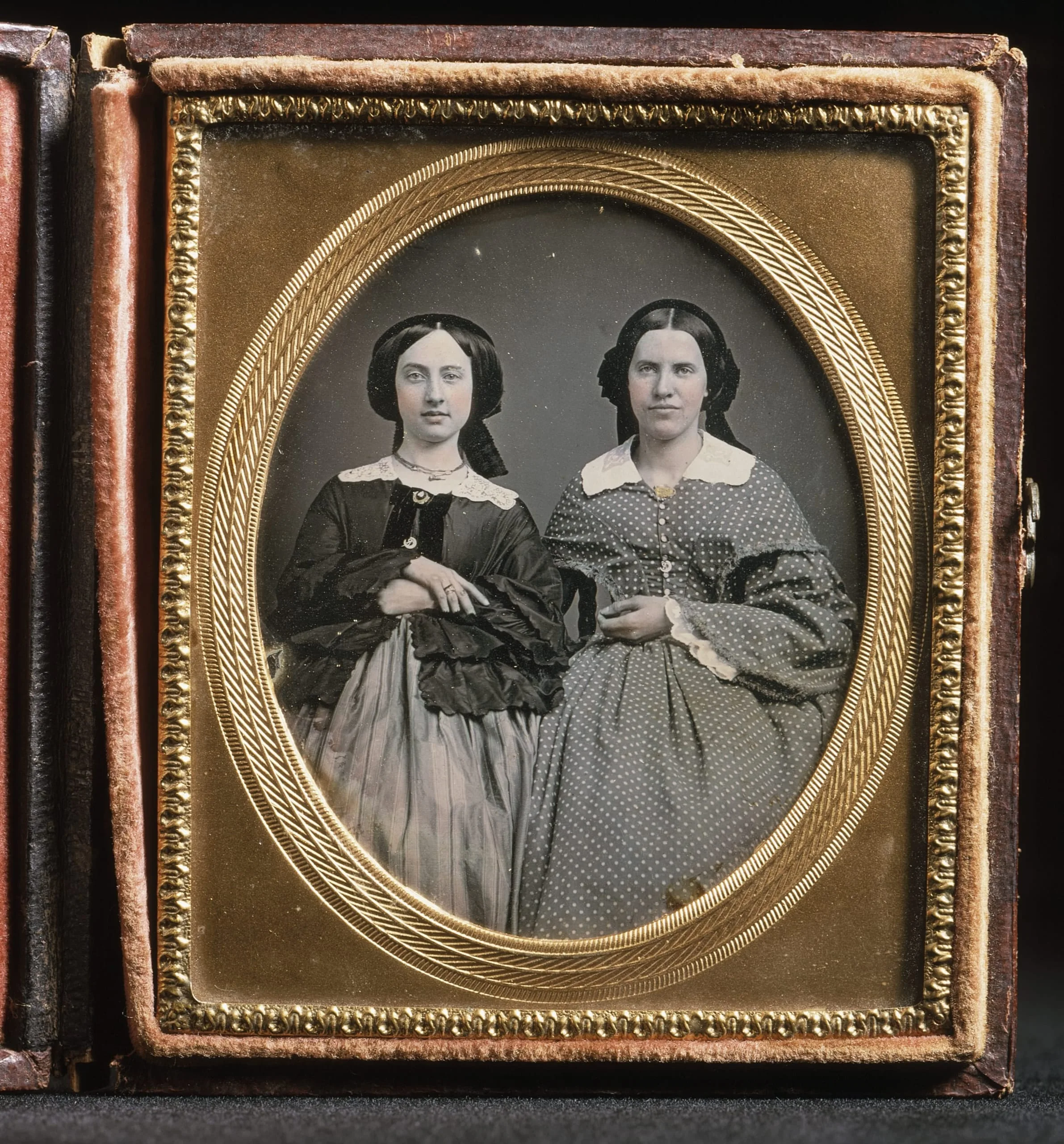 - Daguerreotype (1/6 plate), hand-colored with oval brass mat