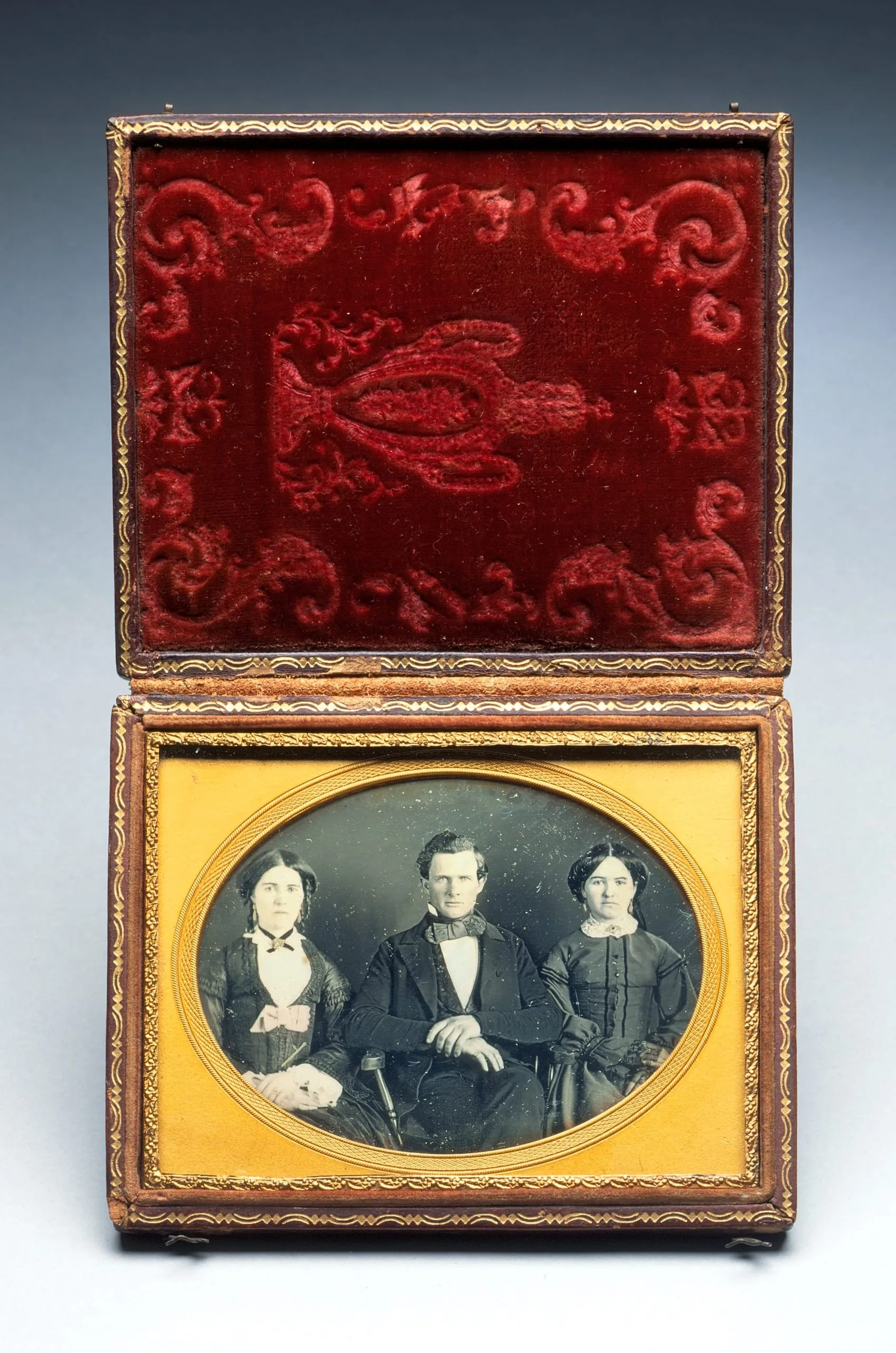 - Daguerreotype (1/4 plate with oval decorative preserver in velvet case, silk-lined)