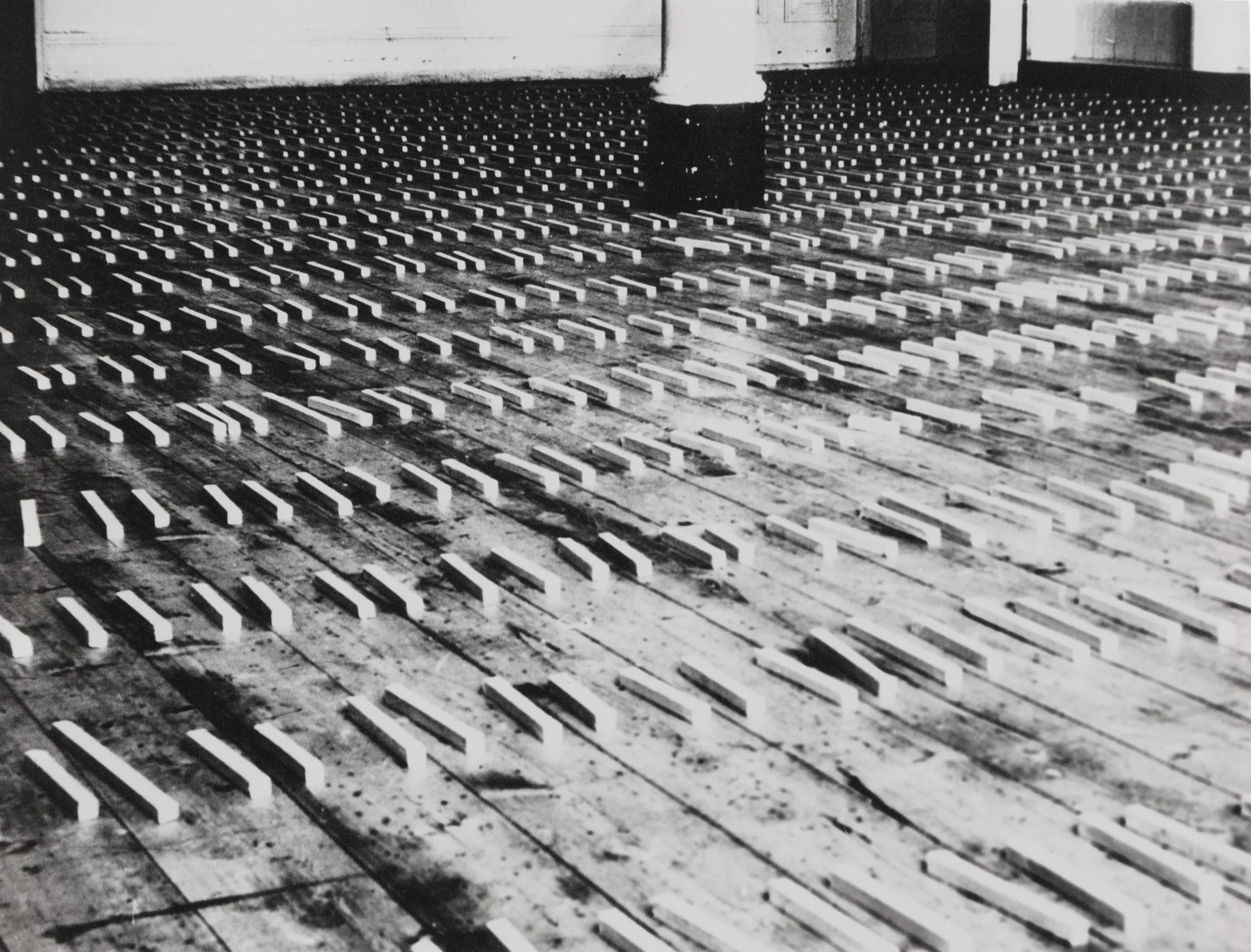 Black and white photograph of hundreds of small white rectangular blocks arranged in diagonal rows across a worn wooden floor in a large interior room