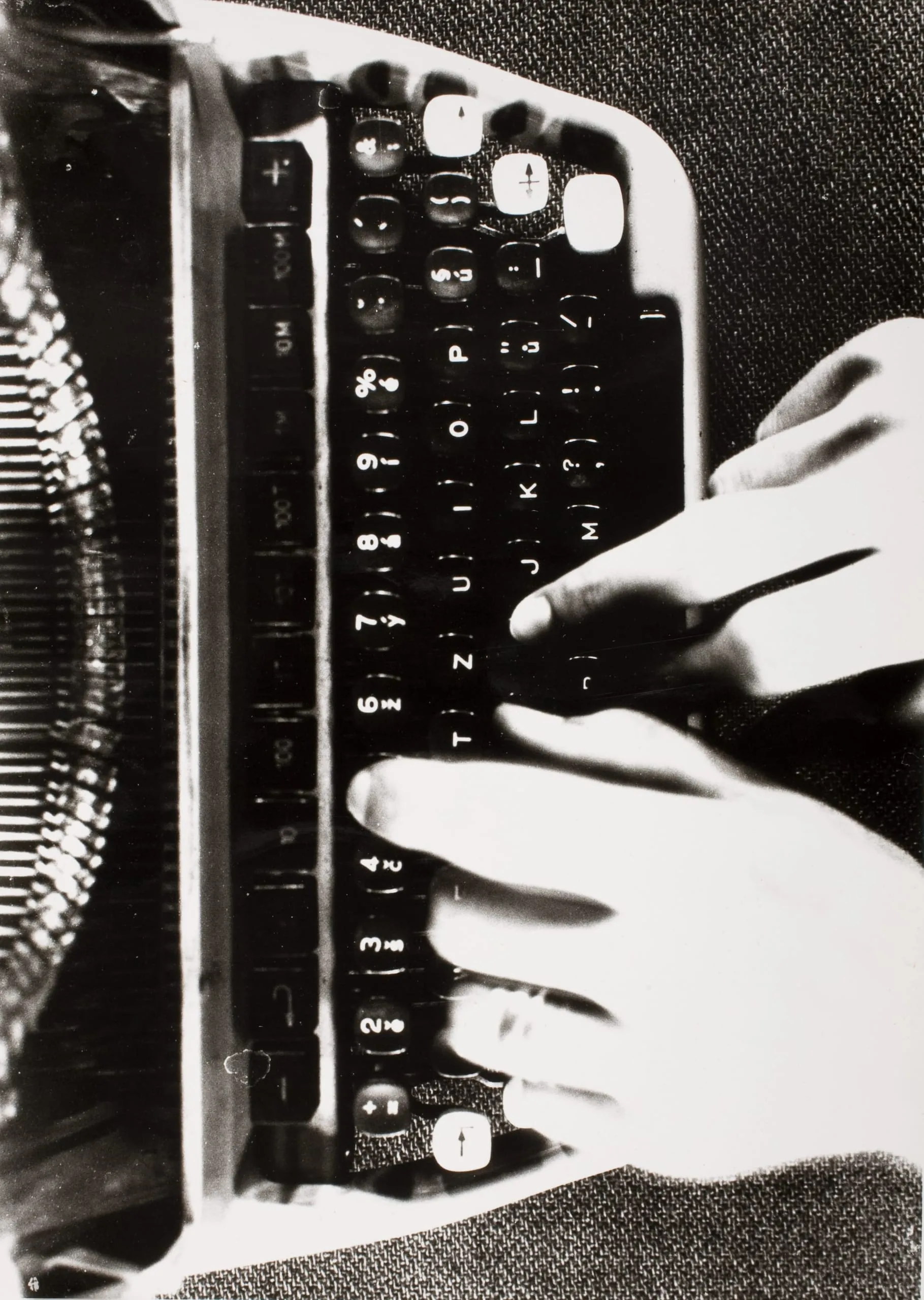Black and white photograph shot from above, two pale hands typing on a vintage typewriter keyboard with round black keys and visible platen to the left