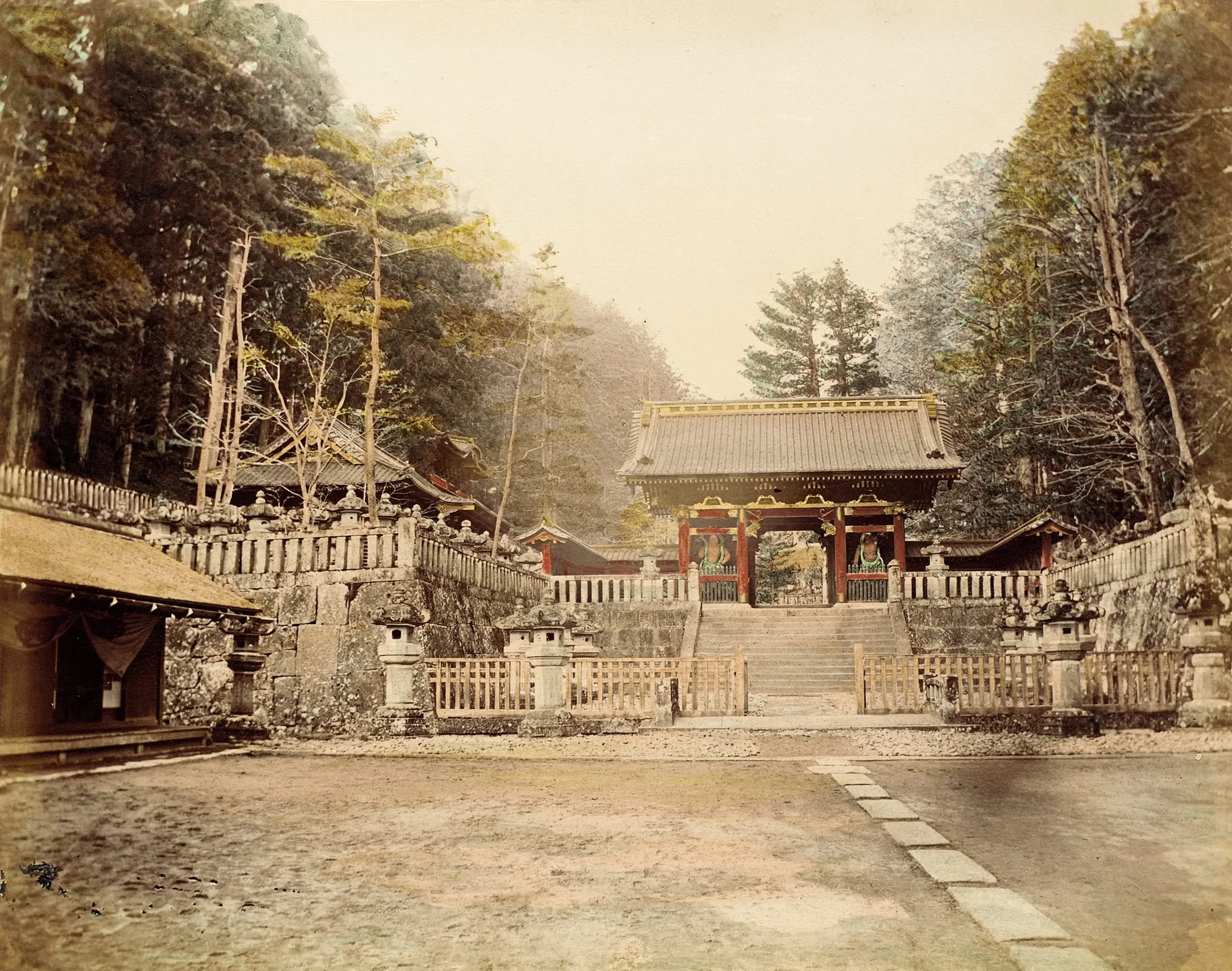Hand-colored albumen or albumen-type photograph of a Japanese shrine complex with a red-and-gold two-story gate at the top of stone stairs, flanked by stone lanterns and tall evergreen trees
