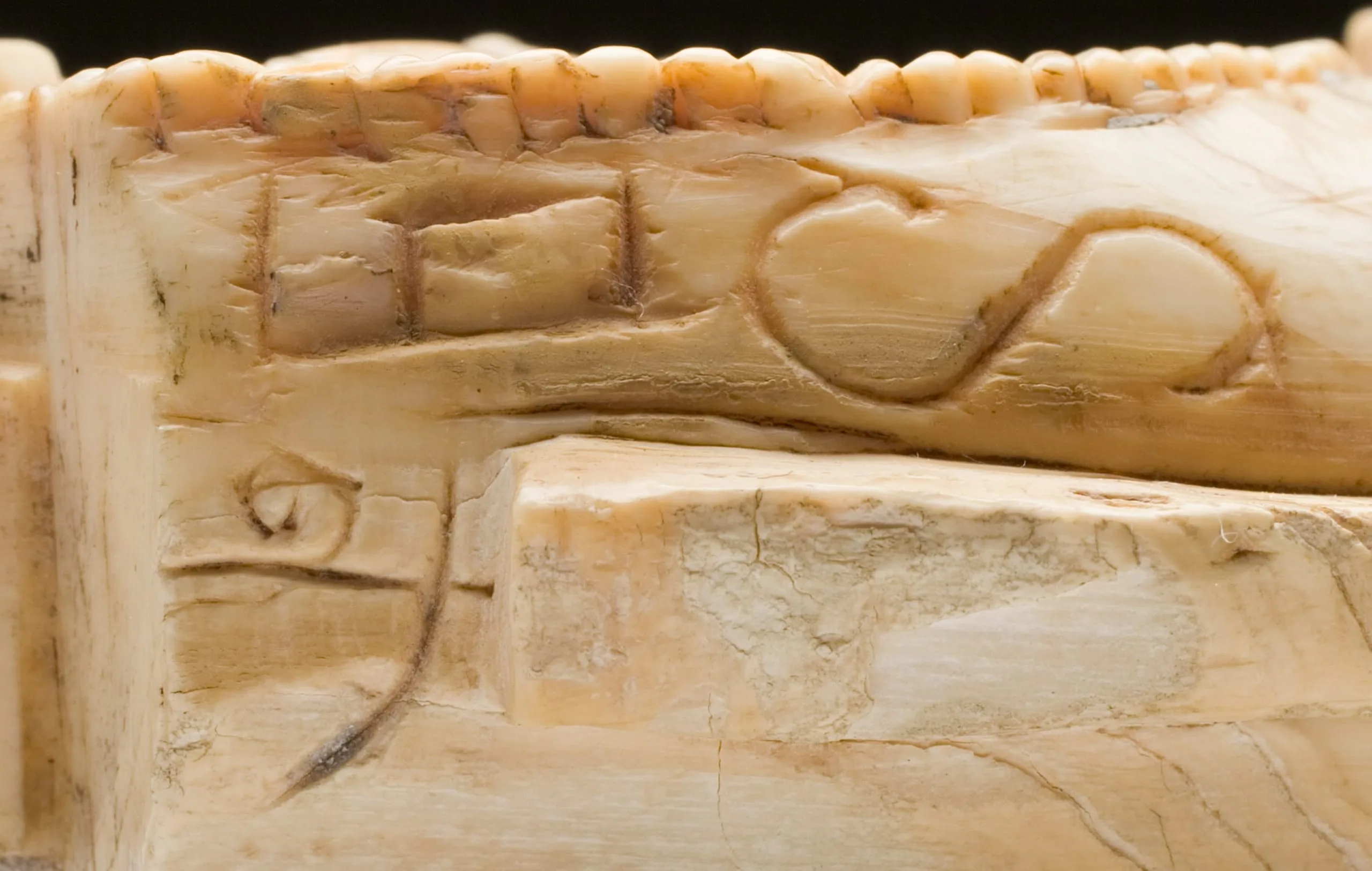 The Madurai region of Tamil Nadu during the Nāyak period (early 16th–early 18th century) was a prolific center of ivory carving. Among the noteworthy object types now dispersed in collections worldwide are figural brackets for ivory thrones and processional mandapas (pillared halls). Such brackets are often fashioned in the form of a rampant animal that is stylistically derived from earlier architectural and sculptural conventions. Most common is a mythical leonine creature (yāli or vyāla). It is depicted rearing on its hind legs, with its proportionally small forelegs and paws held upright and facing forward. The head has the long mane of a mature male lion, which is arranged as a radiant aura with the strands of hair resembling flames. Small ears point upward. The immense bulging eyes are rendered as protruding hemispheres. The mustachioed mouth is widely gaped with snarling upper lips, a prominent row of upper fangs with large curved canines in the rear, and a discrete row of lower teeth. A long plume or frond, either plain or adorned with pearls, extends from the lower lip to an open lotus flower in front of the feet at the base. The tail is that of a lion, long with articulated ends. Floral sprays adorn the hips.