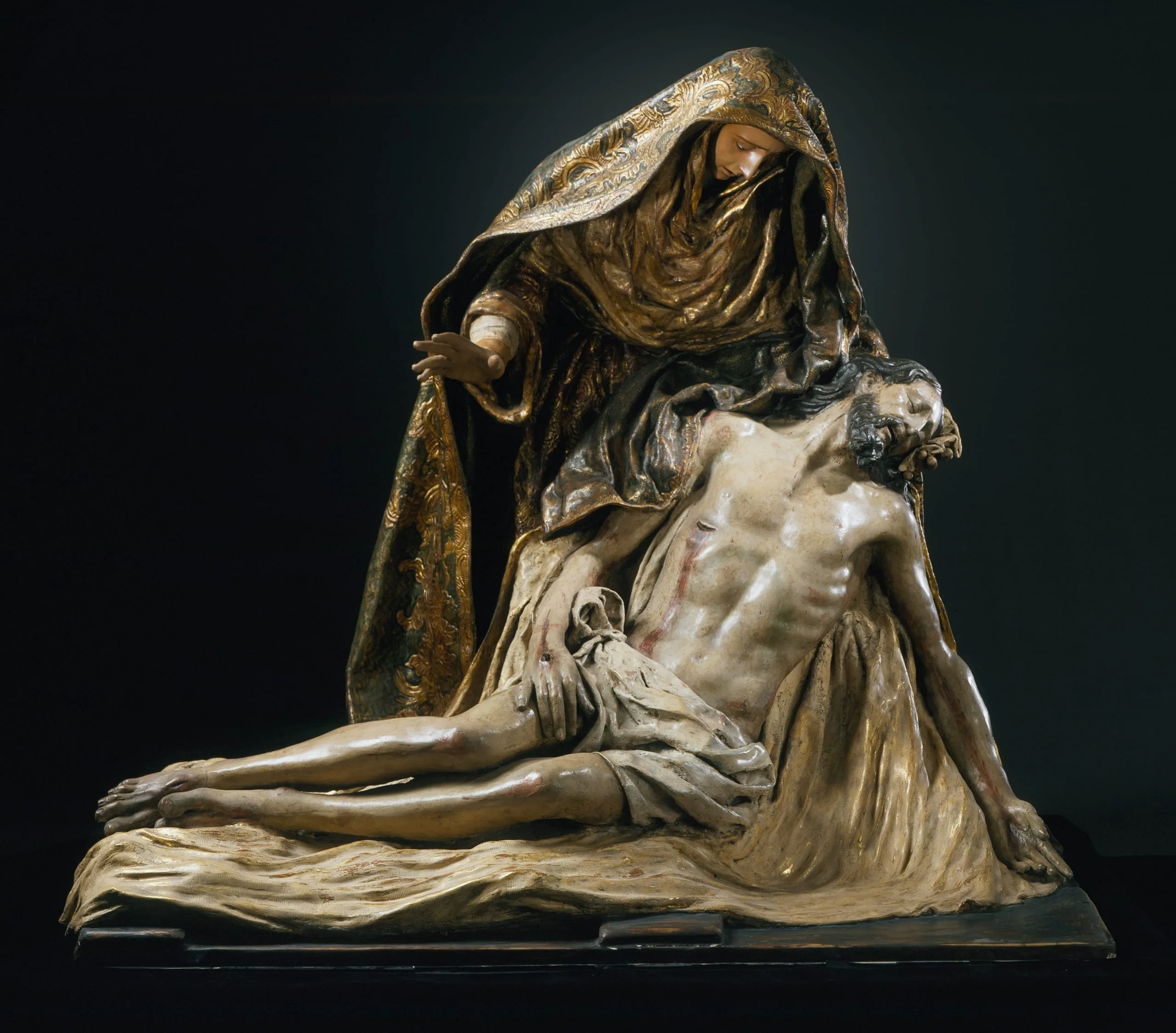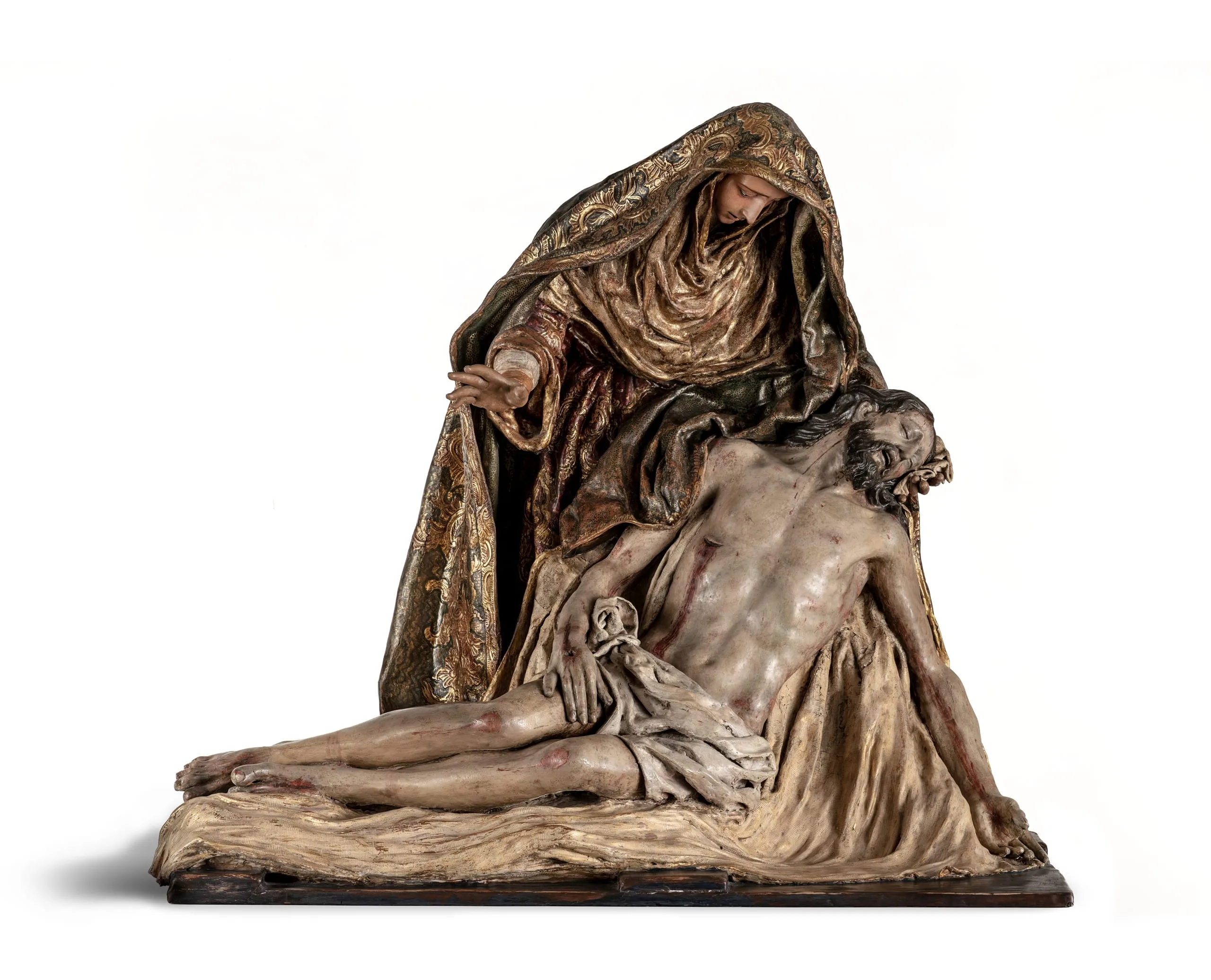- Polychromed plaster, macerated linen fibers, gesso- or glue-soaked fabric, wood, papier-mâché, glass and other materials