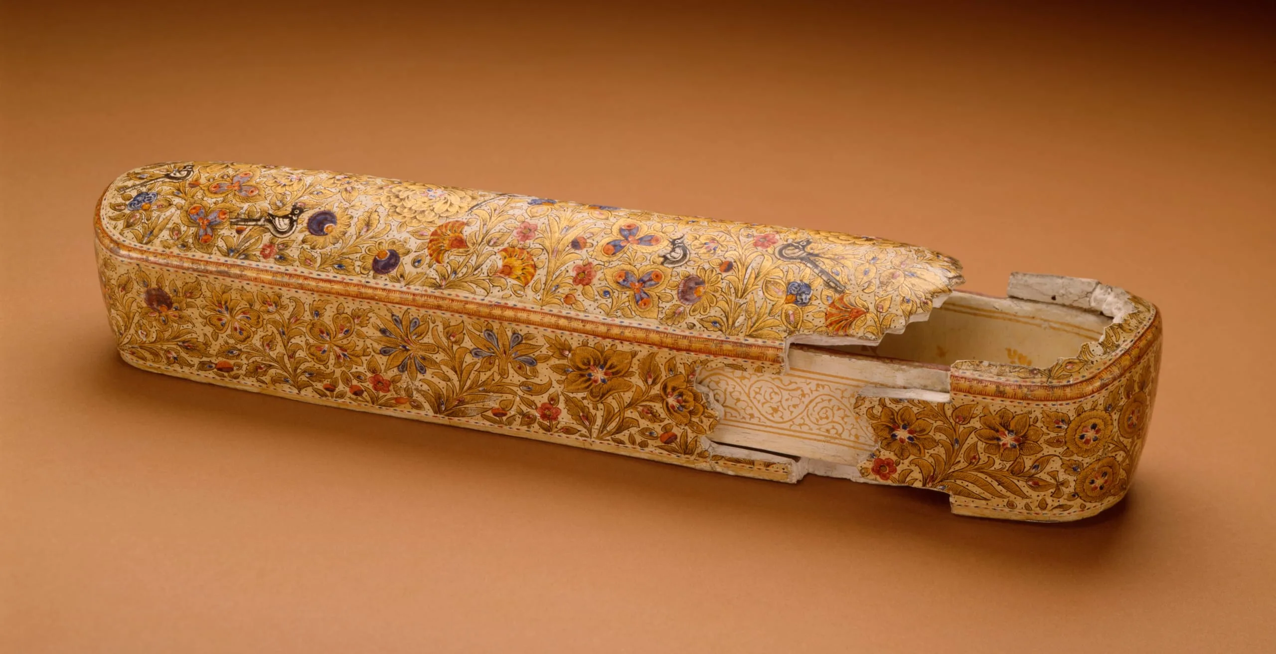 Made of papier-mâché with paint and gold leaf, this pen box is fashioned in the traditional manner with a horizontal tray for writing implements that is attached to an end of the pen box and constructed so as to slide into a decorated shell. The exterior is adorned with the so-called "rose pattern," which features on the rounded top a lush field of vegetation consisting of various stylized polychromatic blossoming floral sprays interspersed with songbirds. The sides of the pen box have a series of flowering plants in gold with less exuberant blossoms mainly accented in blue and red. The sliding pen tray is decorated with the "white and gold pattern" consisting of gold scrolling vines against a cream white background.