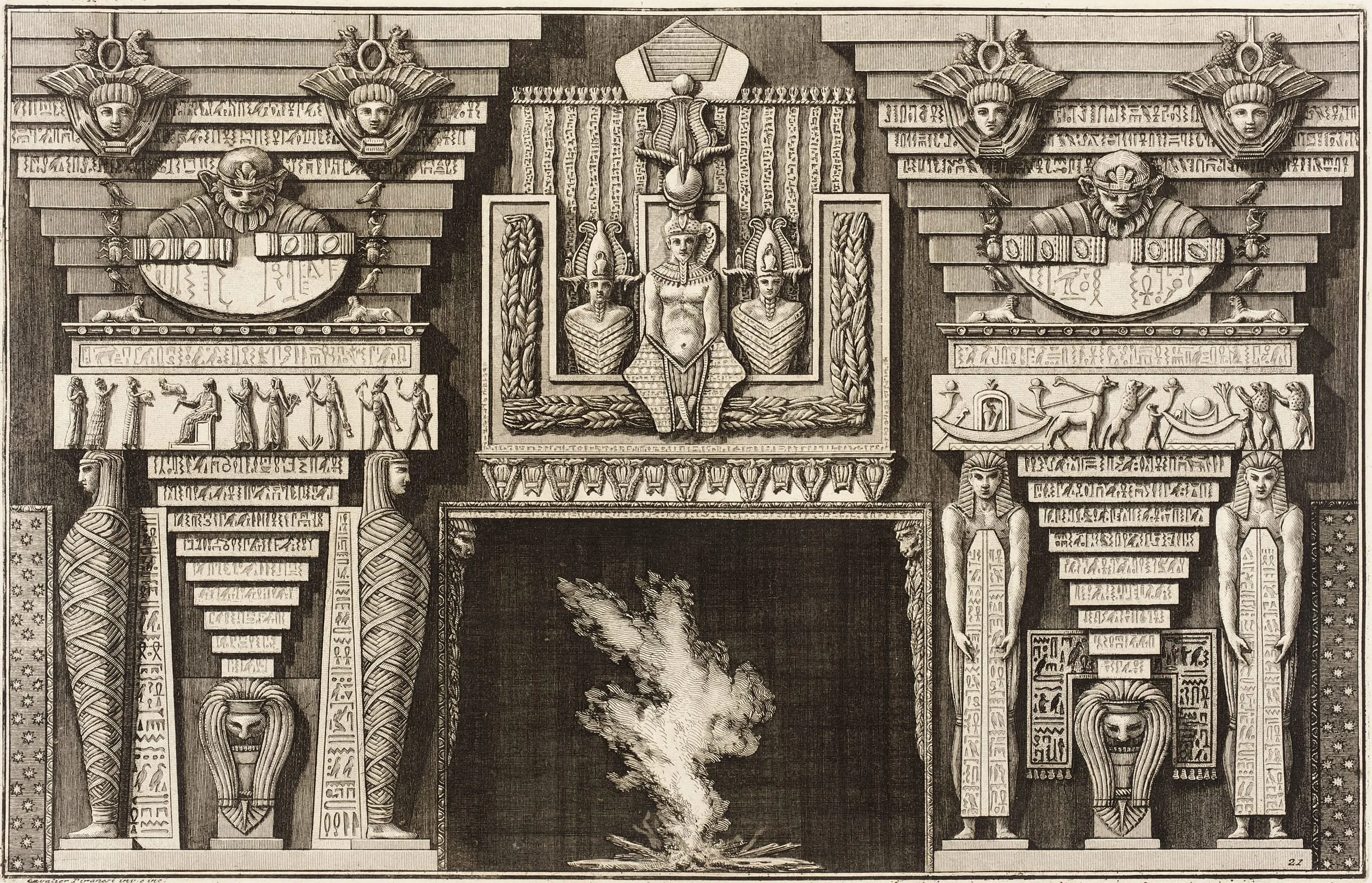 - Chimneypiece in the Egyptian style: Two mummies in profile on the left and two figures bearing obelisks on the right.