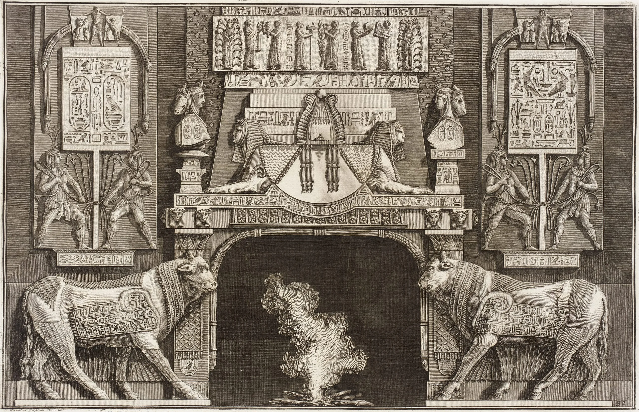 - Chimneypiece in the Egyptian style: Lintel with addorsed Sphinxes flanked by bulls in profile.