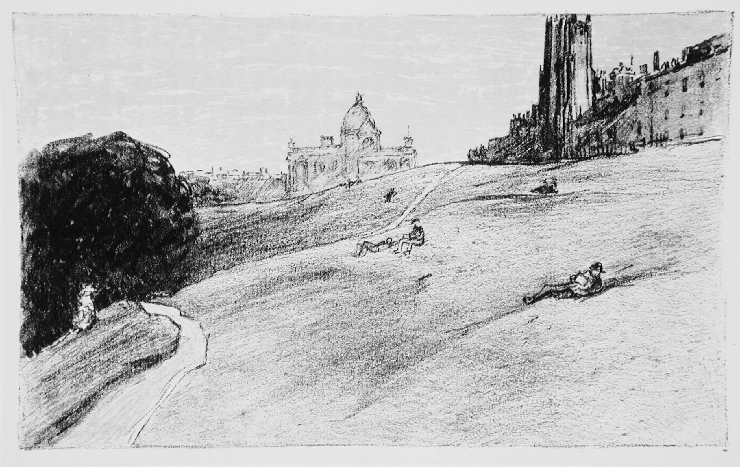 - Lithograph printed in dark green, light green, black, and ocher on laid paper