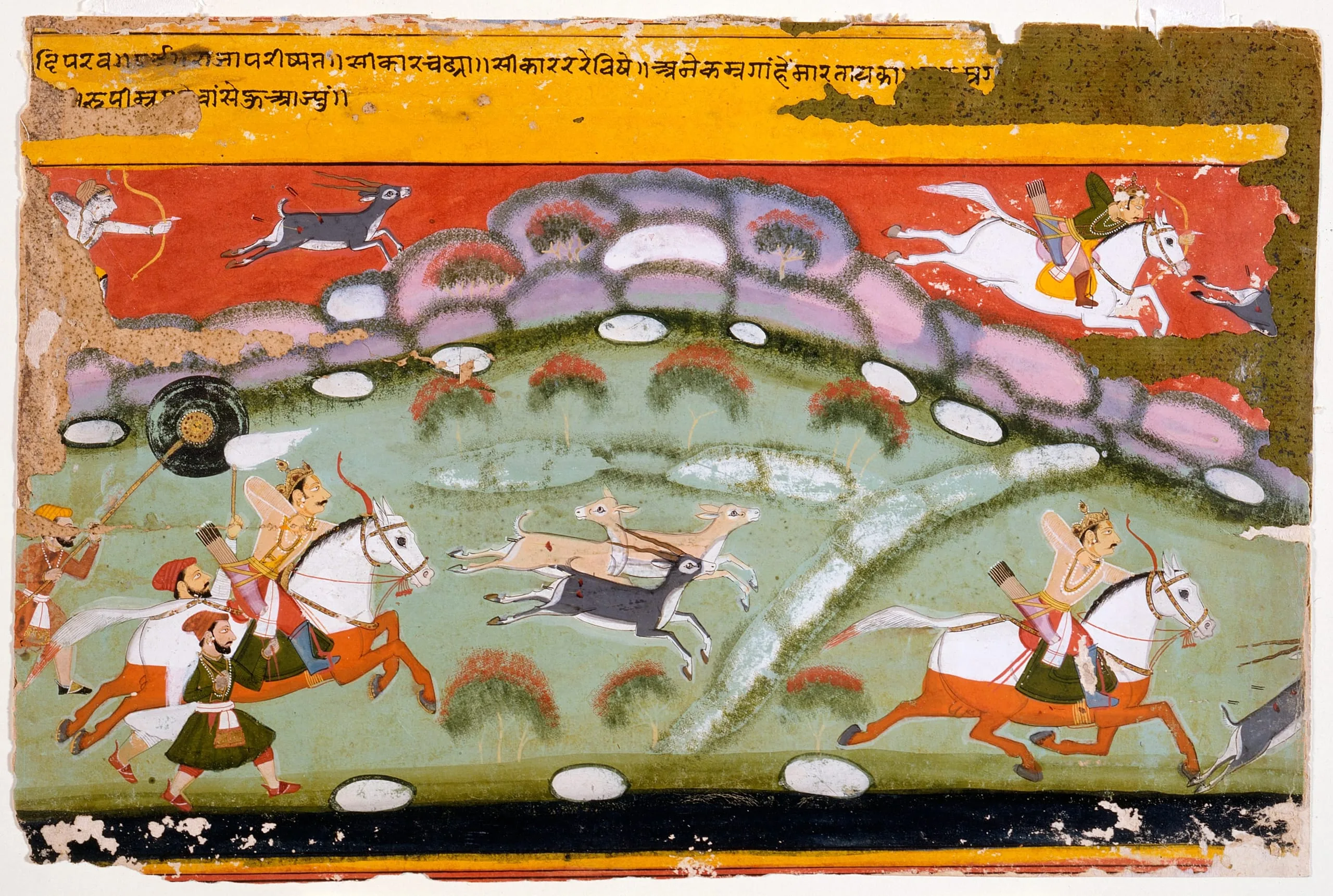 Among its many tales is that of Raja Parikshit, ruler of the Kuru Kingdom (circa 1200-900 BCE). He succeeded his grand uncle Yudhishthira, the eldest Pandava brother. According to the fragmentary devanagari inscription in the header, the illustration depicts an episode in Book 1 (Adi parva). Parikshit, who was renowned as a great archer, enjoyed hunting deer and other wild beasts. One day he shot a deer that fled wounded into the jungle. Parikshit pursued it until he came upon the hermit Samika, who had taken a vow of silence and would not respond when the king asked if he had seen the deer. Enraged, Parikshit draped a dead snake around the hermit’s neck and returned to his capital of Hastinapur, located near old Delhi. When the hermit’s son heard about Parikshit’s insult to his father, he cursed the king. Soon thereafter, Parikshit was bitten by a serpent and died (Mahabharata 1:5:36-40). Here, Parikshit is depicted hunting deer twice in continuous narration.