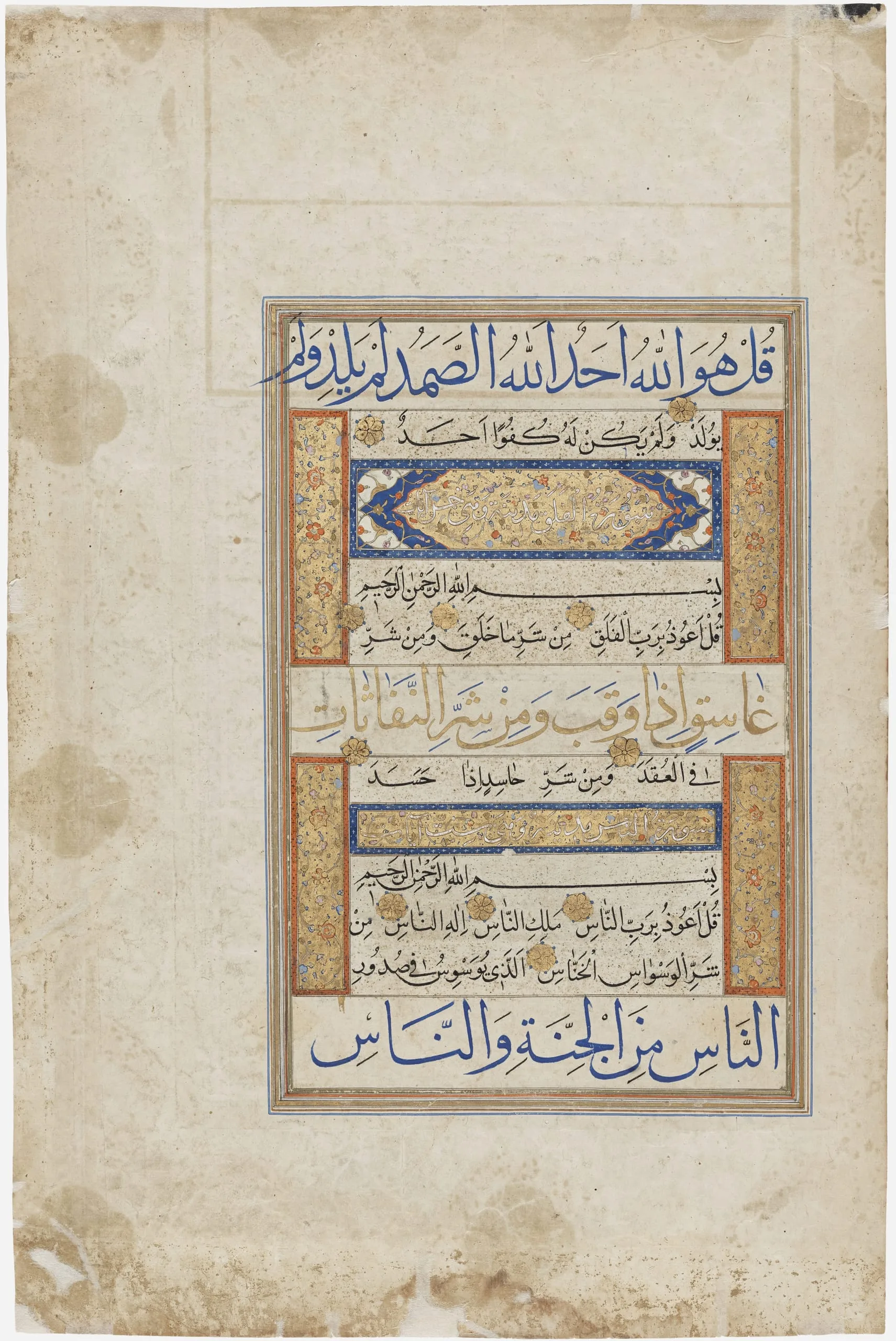 In the second half of the sixteenth century especially, Shiraz was an important hub for the creation of large-format luxury manuscripts of the Qur’an, some of which were intended for export to the Ottoman Empire. This pair of facing pages (also see M.2010.54.1) from the closing section of a dispersed manuscript includes the du‘a al-khatm, or prayer said at the conclusion of a reading of the Qur’an. The beautiful decoration framing the gold calligraphy epitomizes the Shiraz style of illumination in its colorful exuberance. Many similarly decorated manuscripts of the Qur’an are preserved in Istanbul collections, demonstrating a distinct Turkish affinity for the Shiraz style.