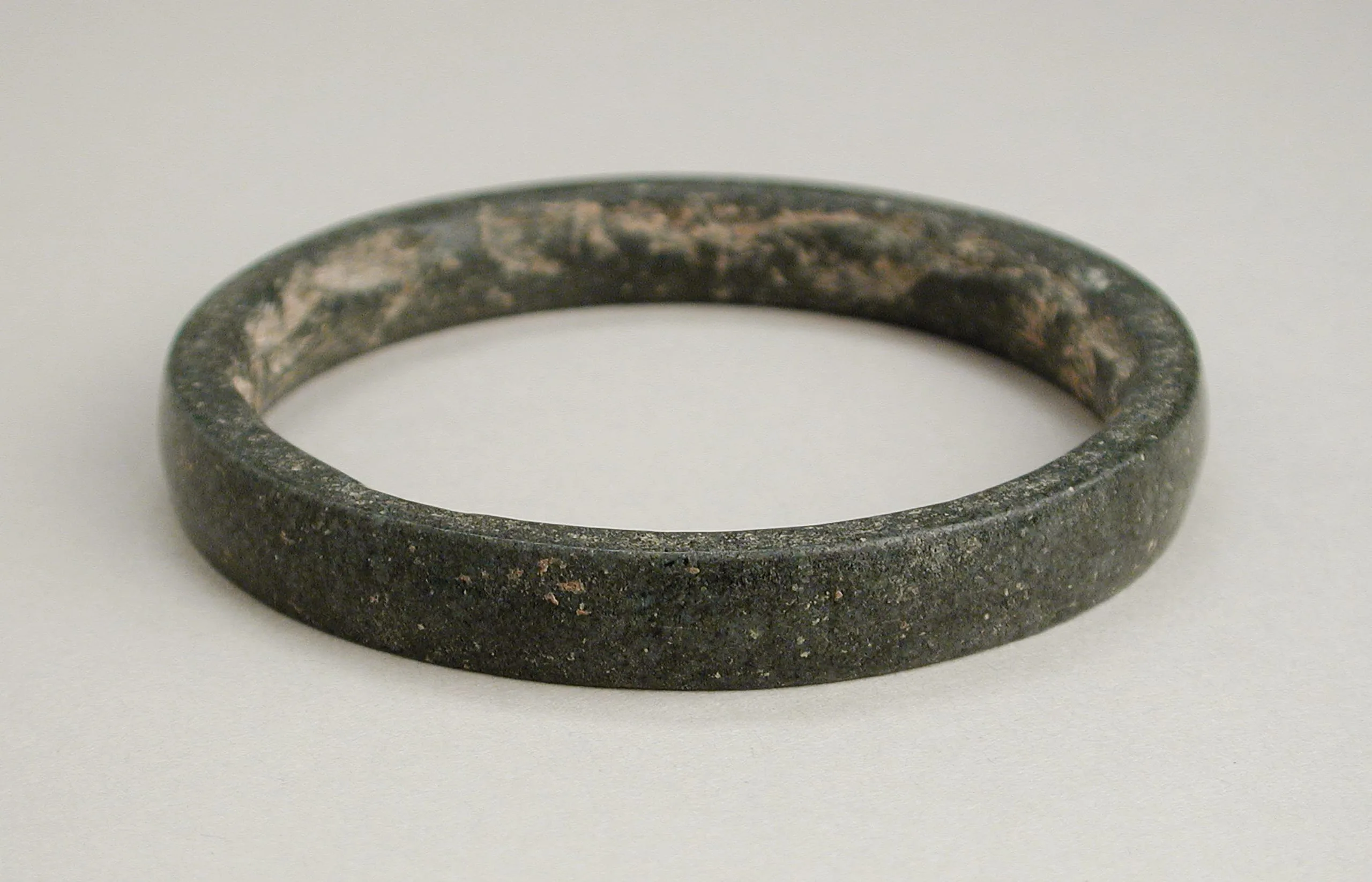 Dark gray-green metal bangle with granular patina and salmon-pink corrosion on the inner edge, photographed from slightly above