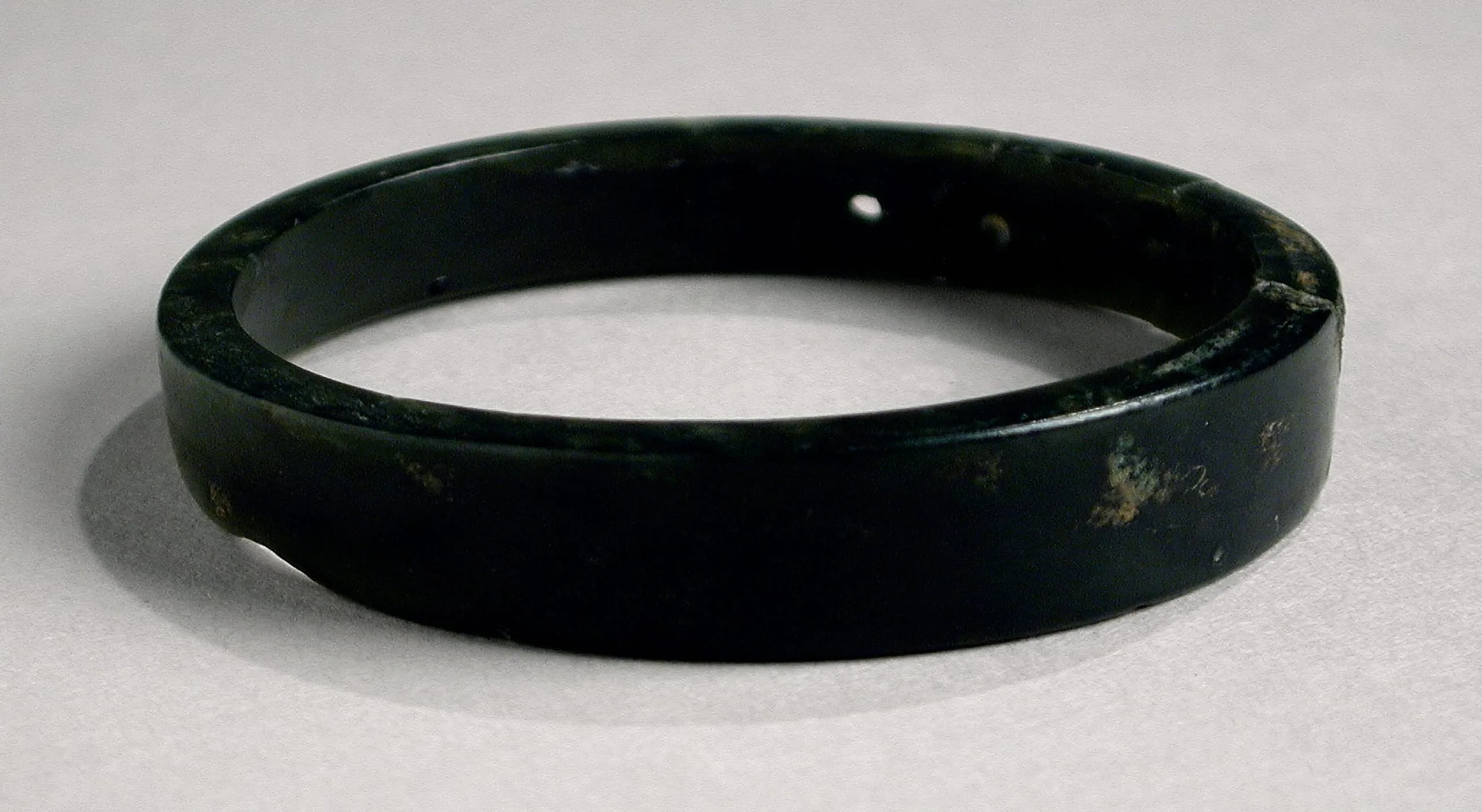 Bronze circular band or bracelet with deep black patina and patches of olive green corrosion, viewed slightly from above on a gray surface