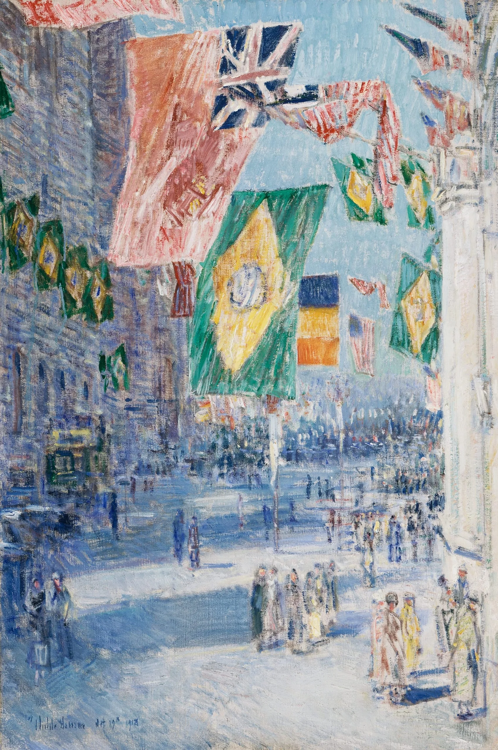 The flags increasingly became the main source of movement and decoration as the series progressed, as they not only became larger but also were more prominently placed. In the paintings from late 1918 such as this one Hassam viewed the flags from below to emphasize their size and positioned them in or near the center of the compositions against a pale sky to form a lively, two-dimensional pattern of colors and designs above the pedestrian-filled street. While the large flags strung across the street wave in the wind, a sense of air and movement is conveyed equally well through the pale palette and exceptionally sketchy, even unfinished surface.