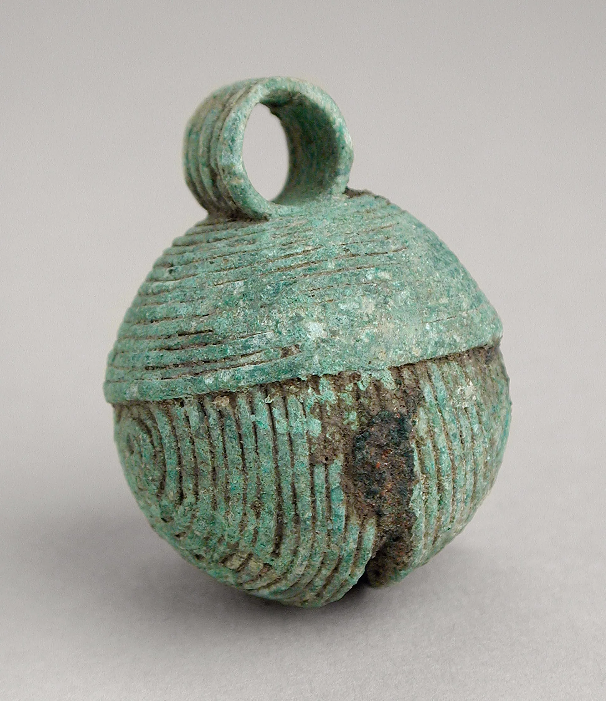 Small bronze bell with heavy green patina, spherical body with incised ribbed lines, loop handle at top, horizontal seam dividing upper and lower halves