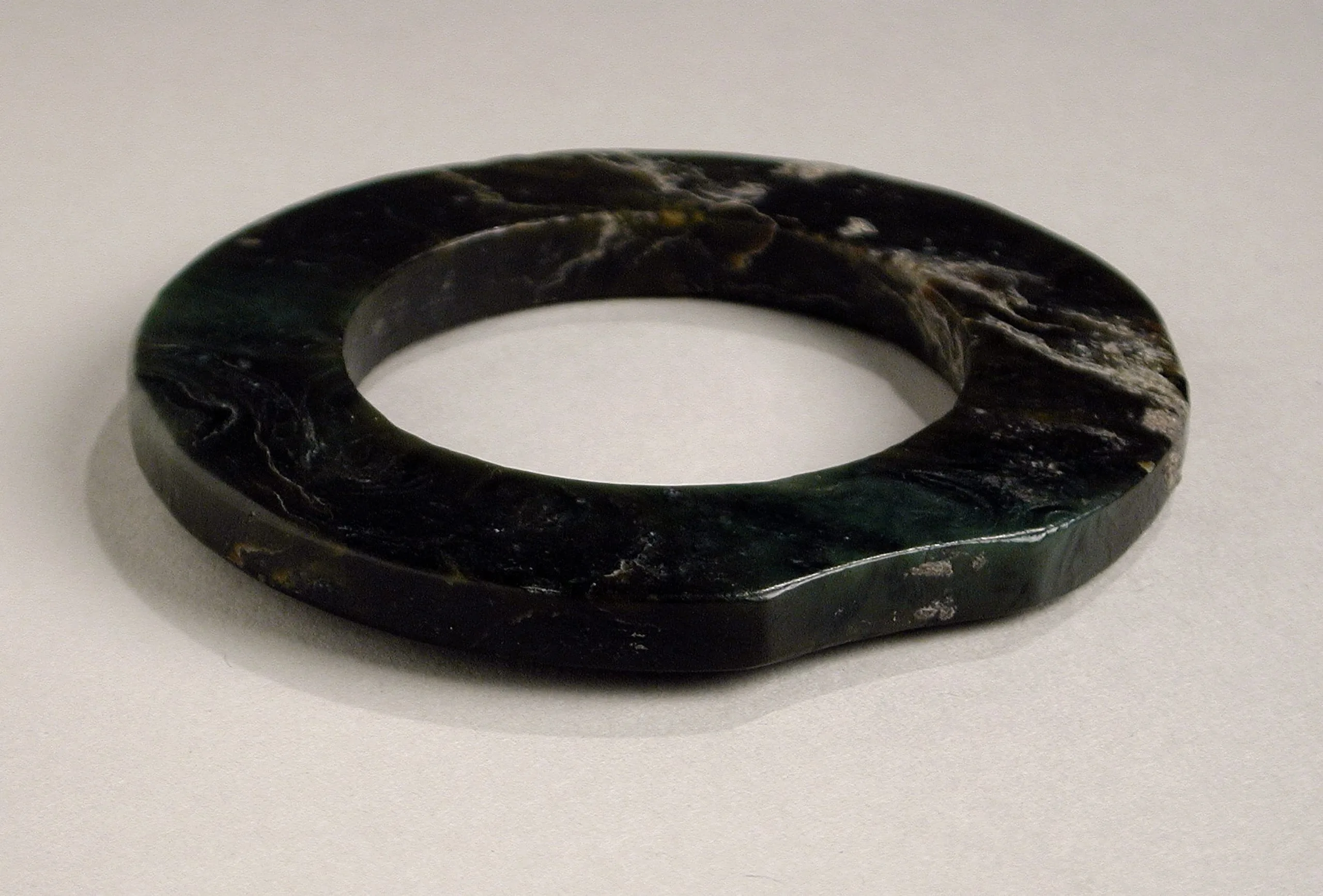 Polished stone ring carved from dark green and black veined stone with irregular surface, viewed from slightly above