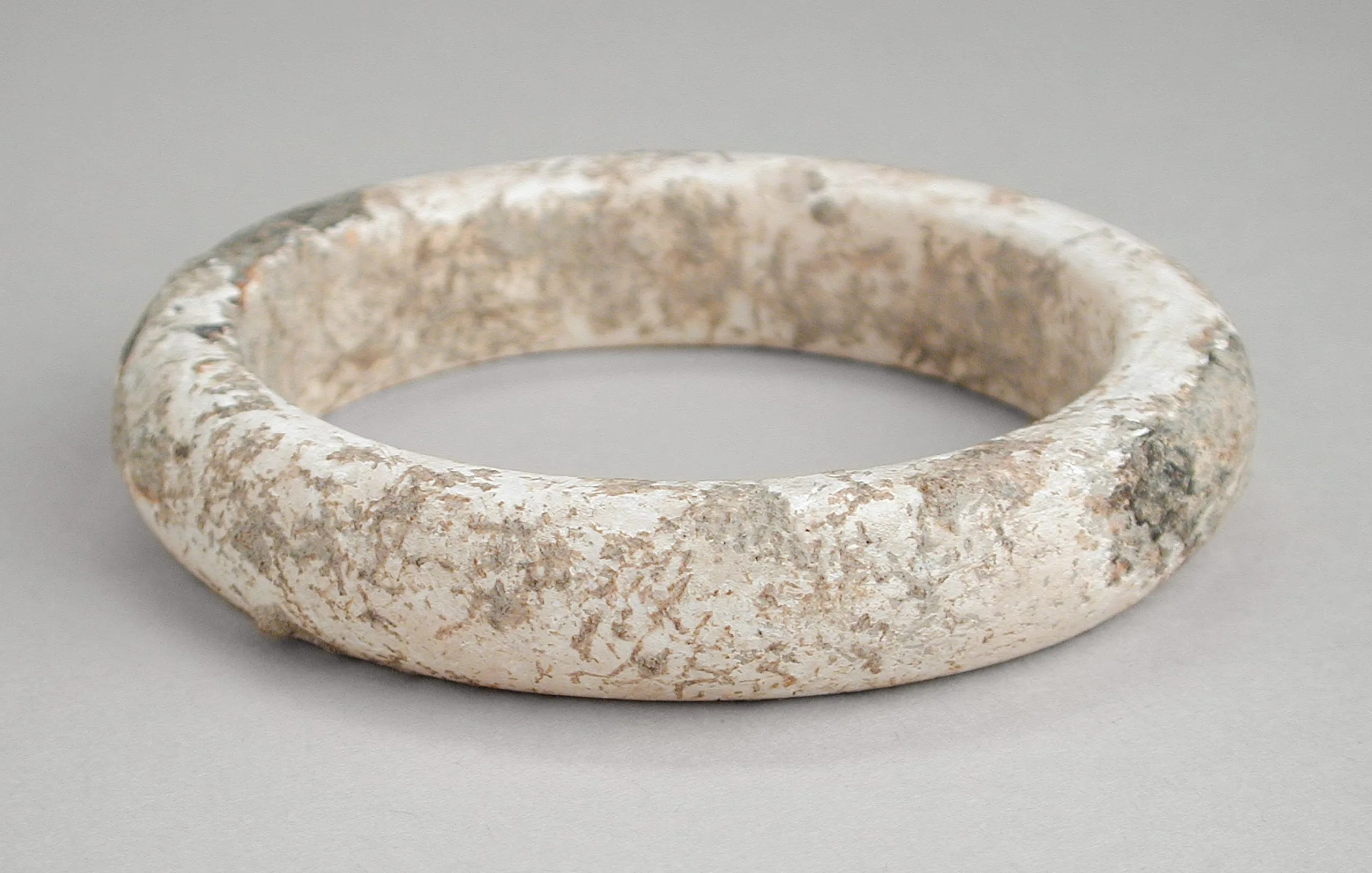 Stone or jade bangle bracelet with rounded cross-section, heavily weathered surface in chalky white and tan with patches of gray-green