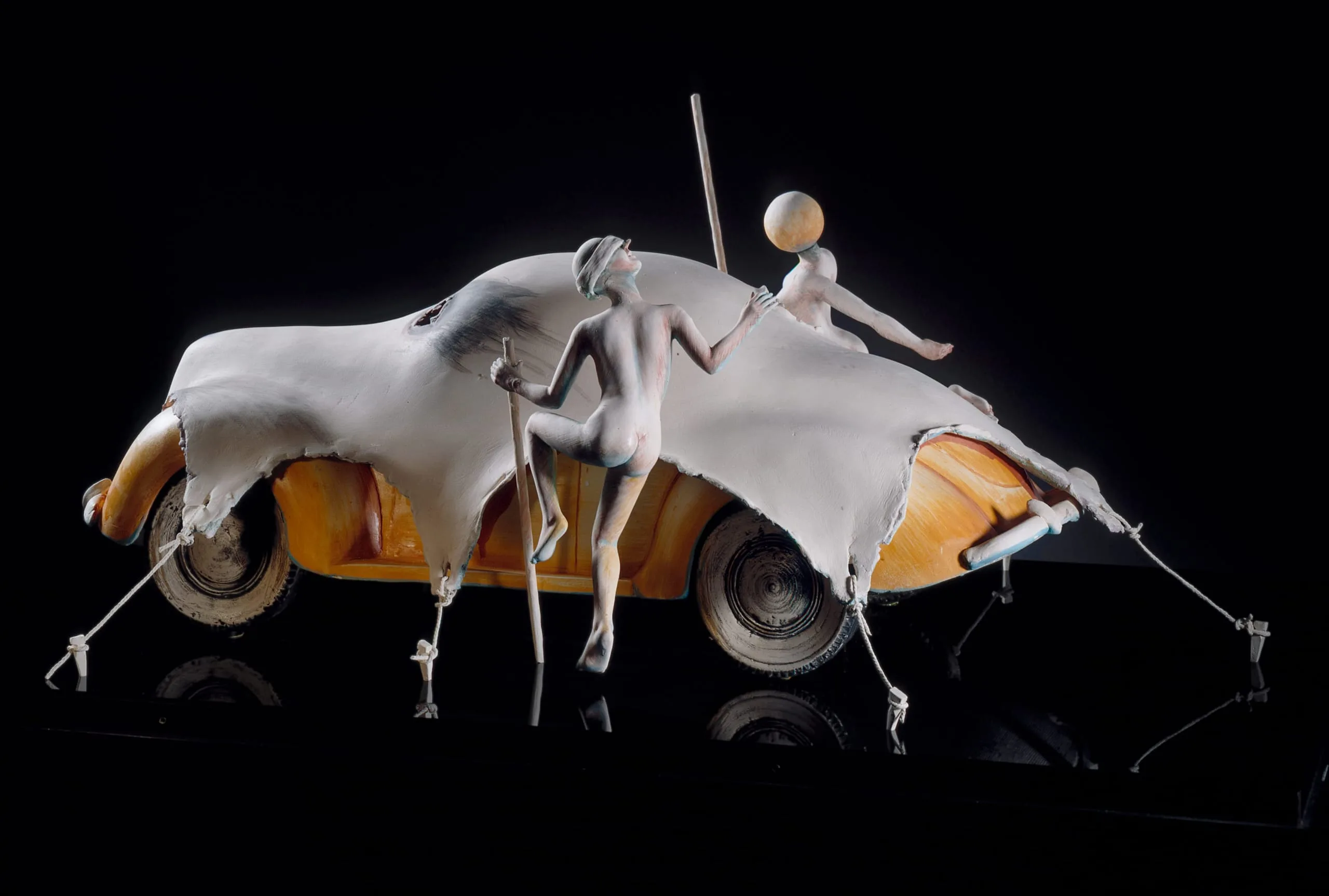 - Low fire whiteware, underglaze, wood cord, plexiglass