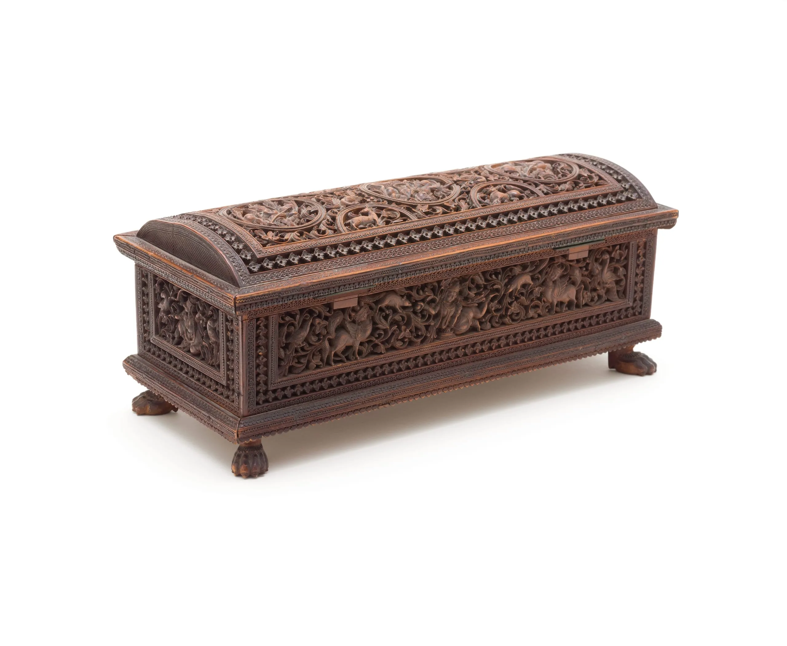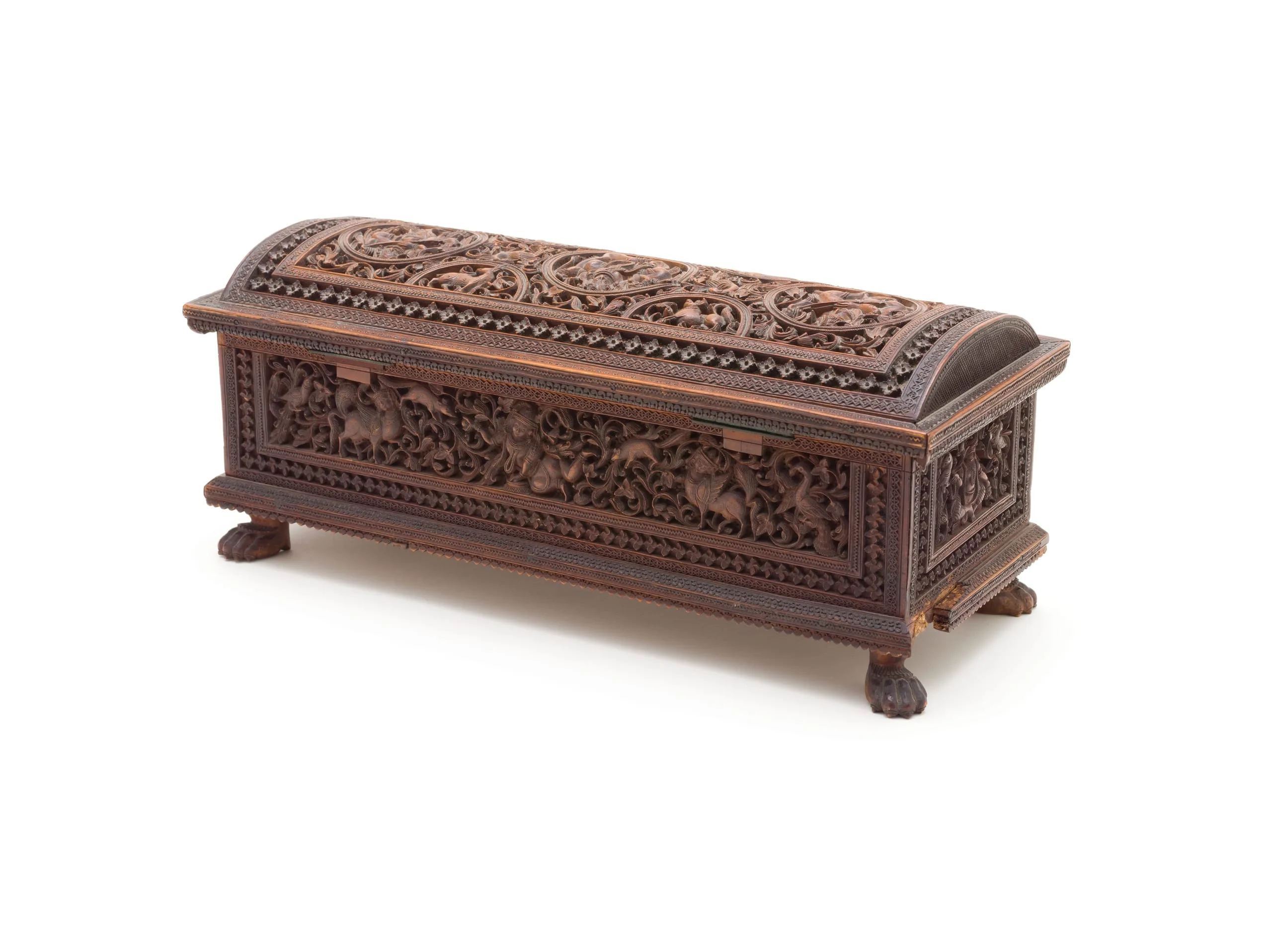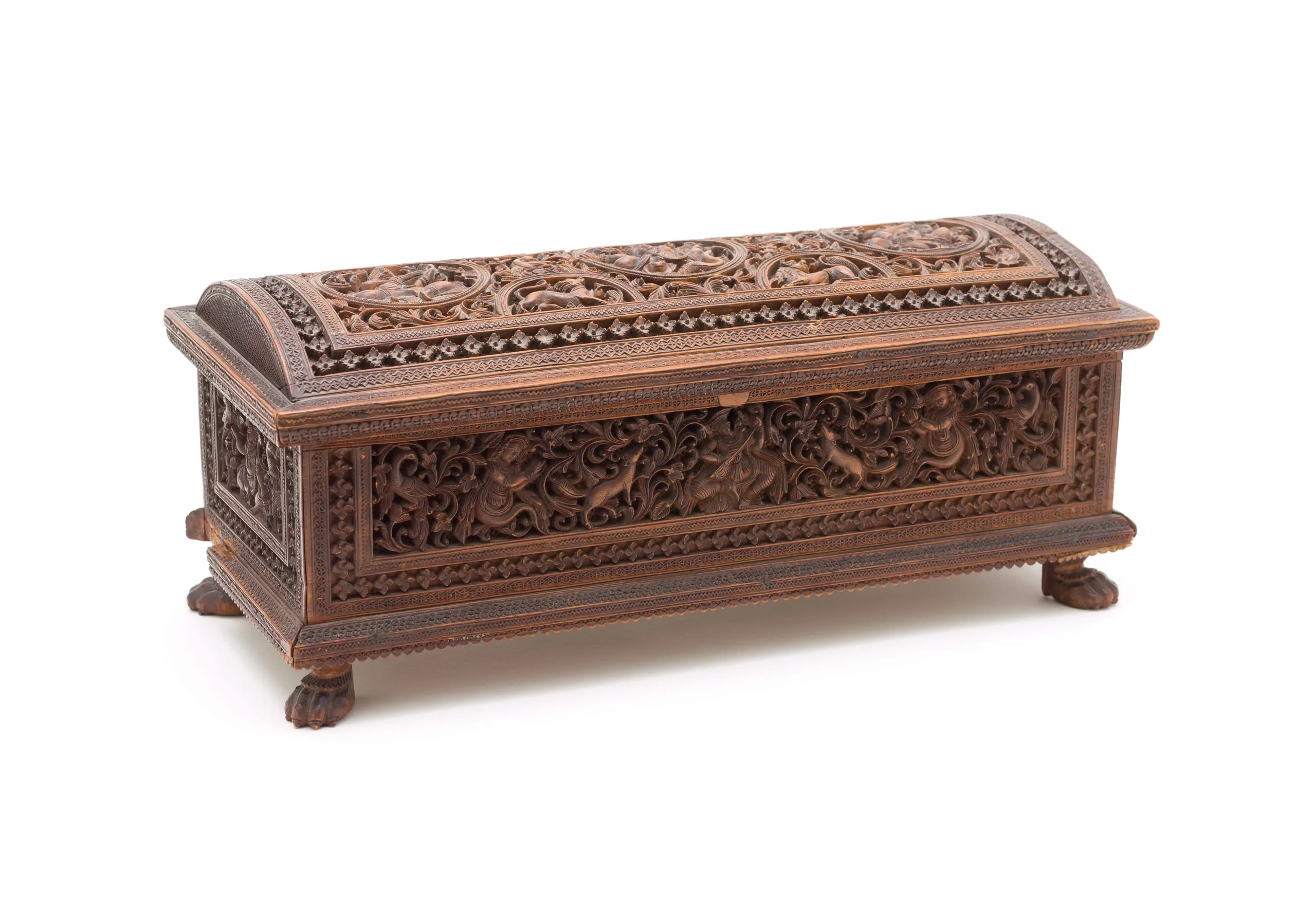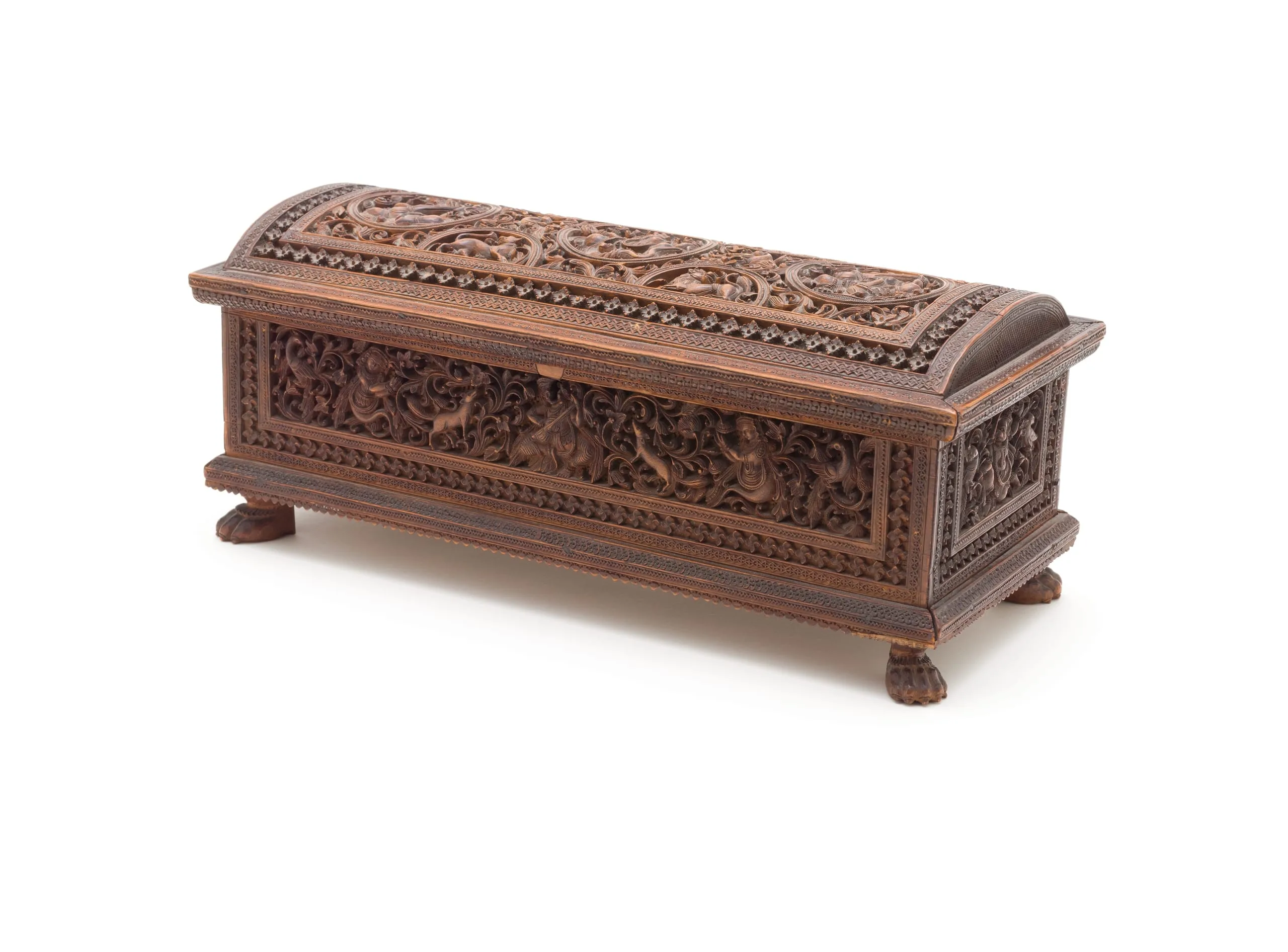 The cabinet is rectangular with an overhanging hinged lid in the form of a hemispherical dome adorned with three Hindu deities in roundels and half-roundels containing three lions and one antelope. The roundels are set amidst deeply carved foliage enlivened with two peacocks. The casket is supported by claw feet.