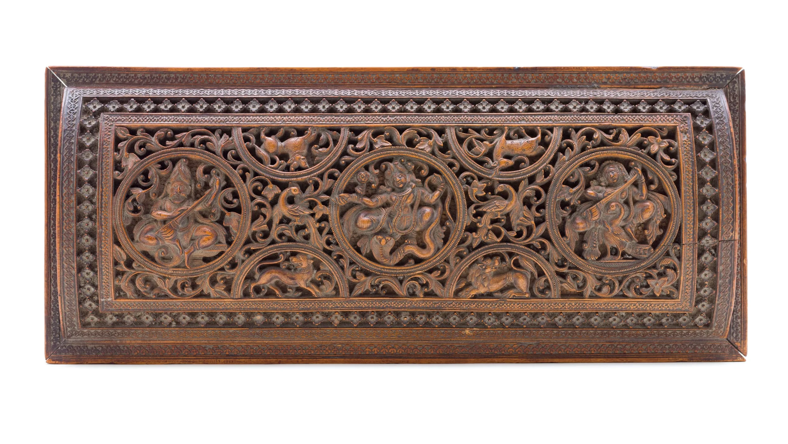 The roundels on the top of the casket feature images of Vyasa, the master musician and sage; Krishna subduing the serpent Kaliya; and Sarasvati, the goddess of music and learning (left to right). The casket’s front face has Shiva playing a musical instrument in the center. He is flanked by two mongooses in heralding postures and two kinnari (celestial half-woman, half-bird). On the reverse is Krishna stealing butter, flanked by two kamadhenu (celestial wishing cows). The left end depicts the sage Agastya, while the right end has the monkey general Hanuman.