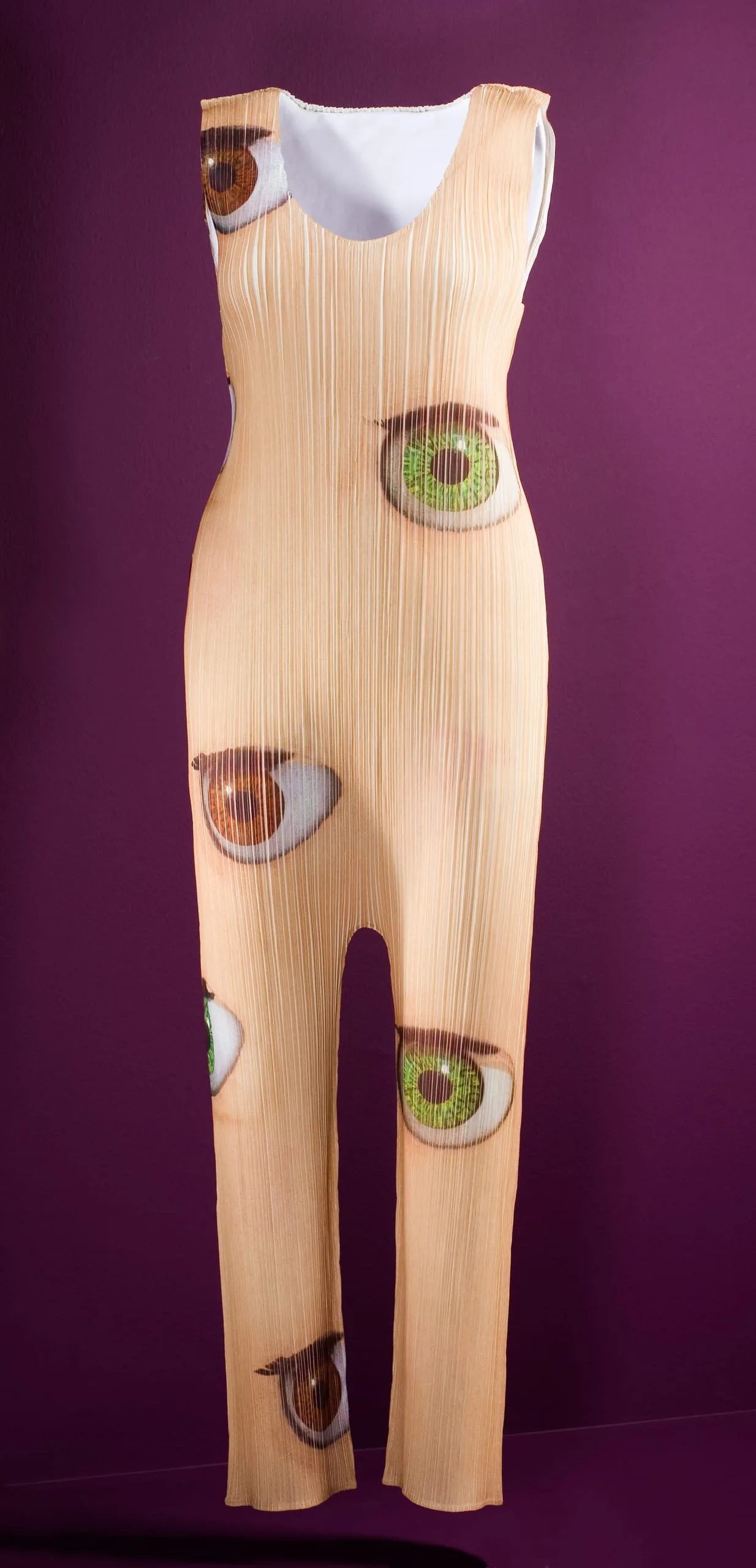 - Polyester knit; printed, with heat- and pressure-set pleats