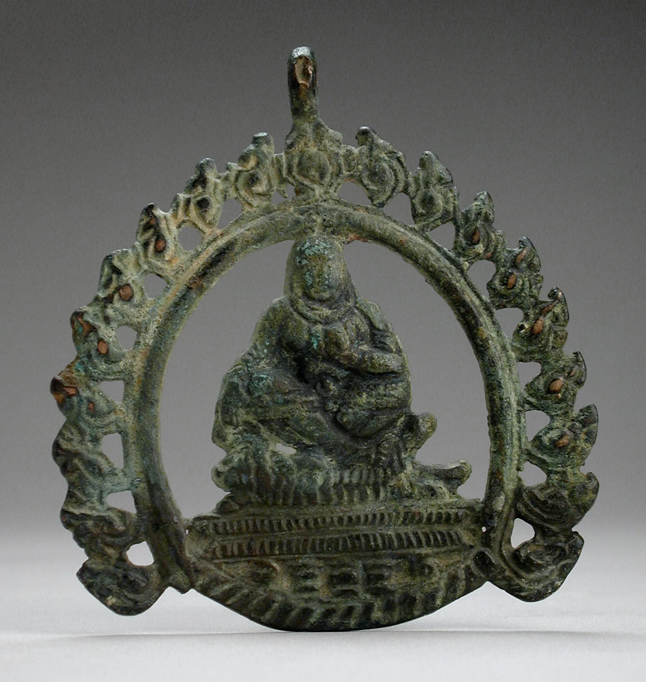 This openwork, unbacked circular pendant with a border of flames depicts an enigmatic personage. According to John and Susan Huntington, it likely represents an enlightened Vajrayana Buddhist tantric teacher known as a siddha (male) or a siddha woman (personal communication to Stephen Markel, 1999).