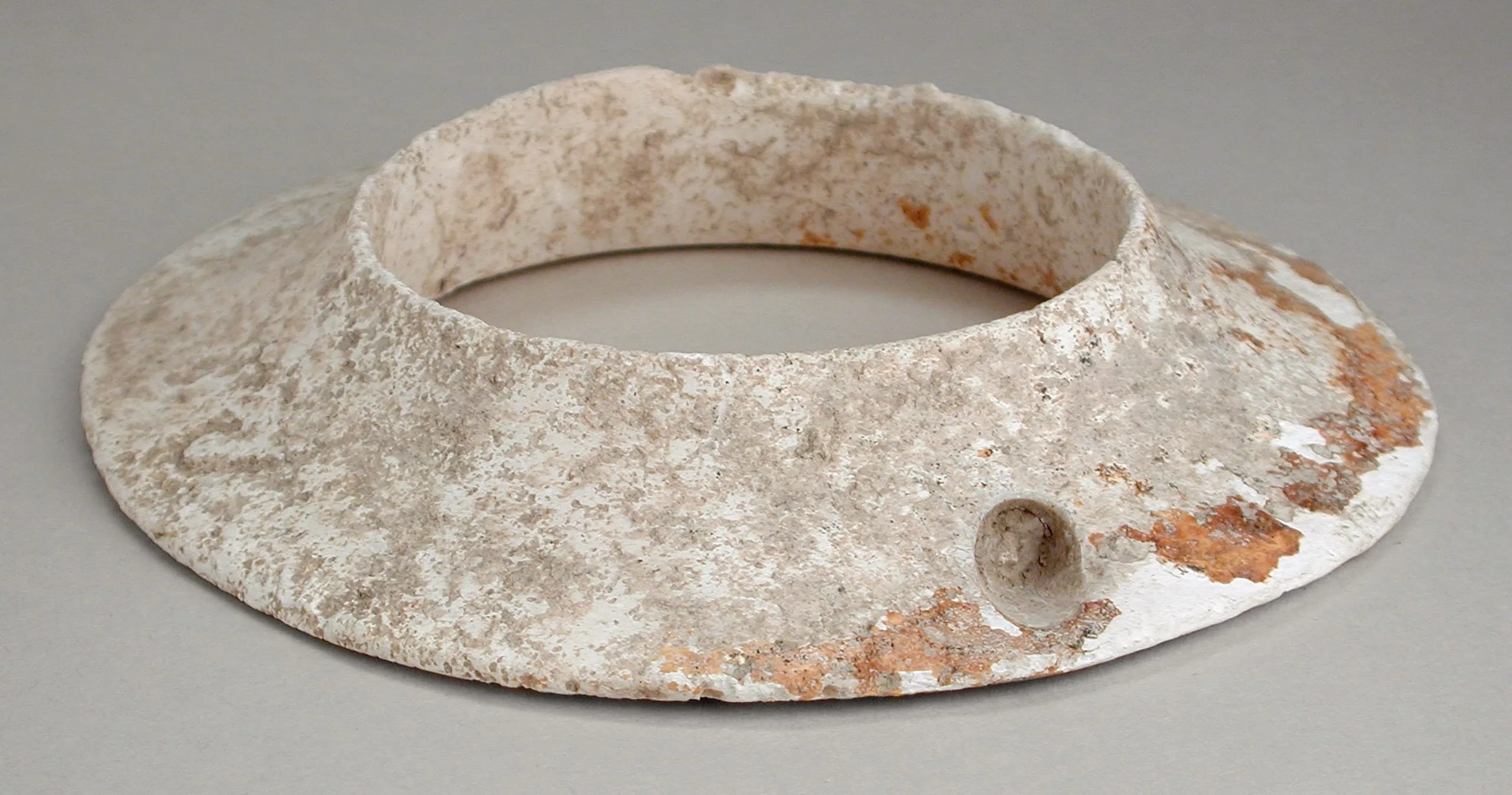 Heavily corroded ring-shaped metal object with wide flat brim, white coating with rust-orange patches, and a small cylindrical spout on the side