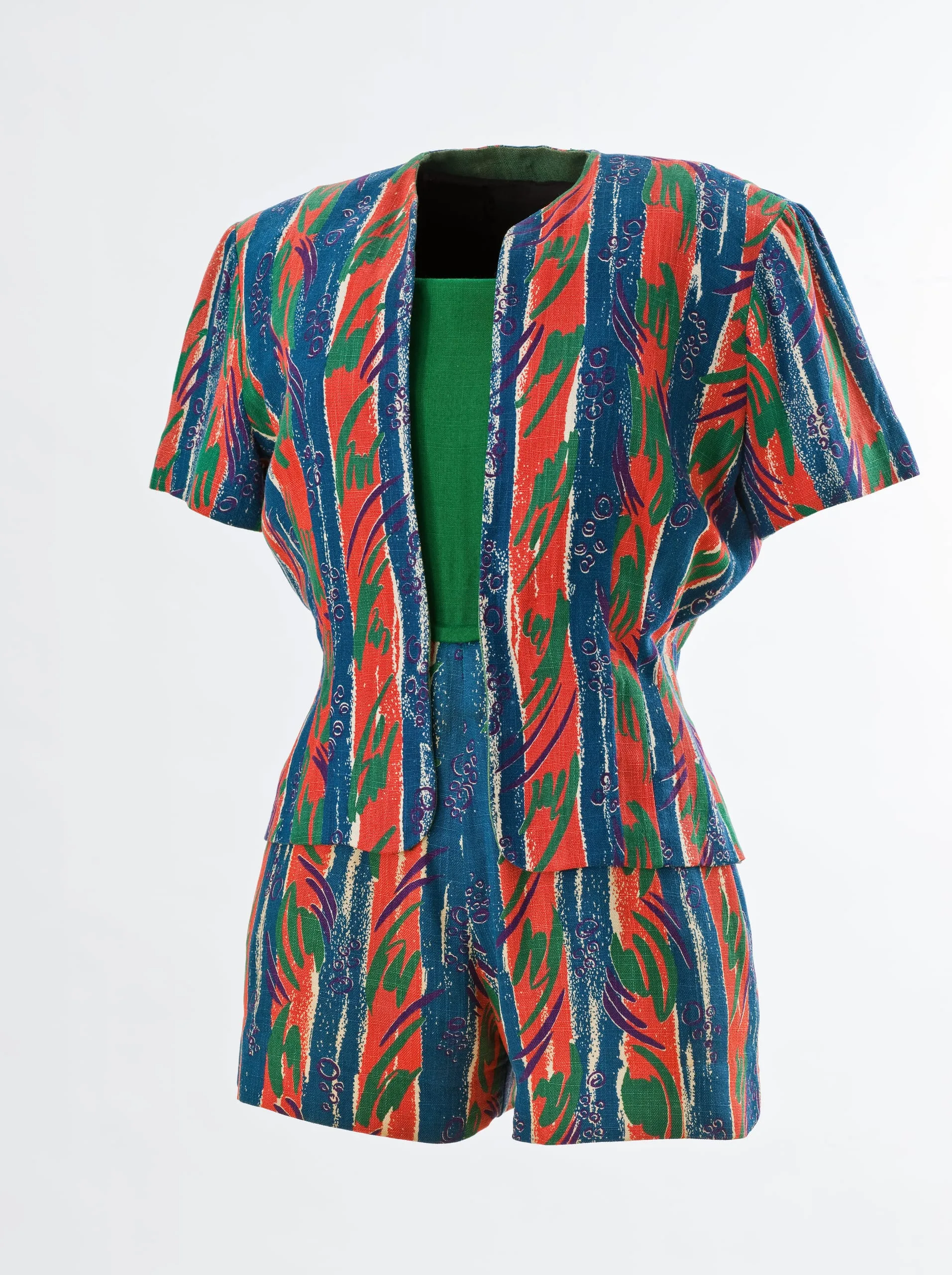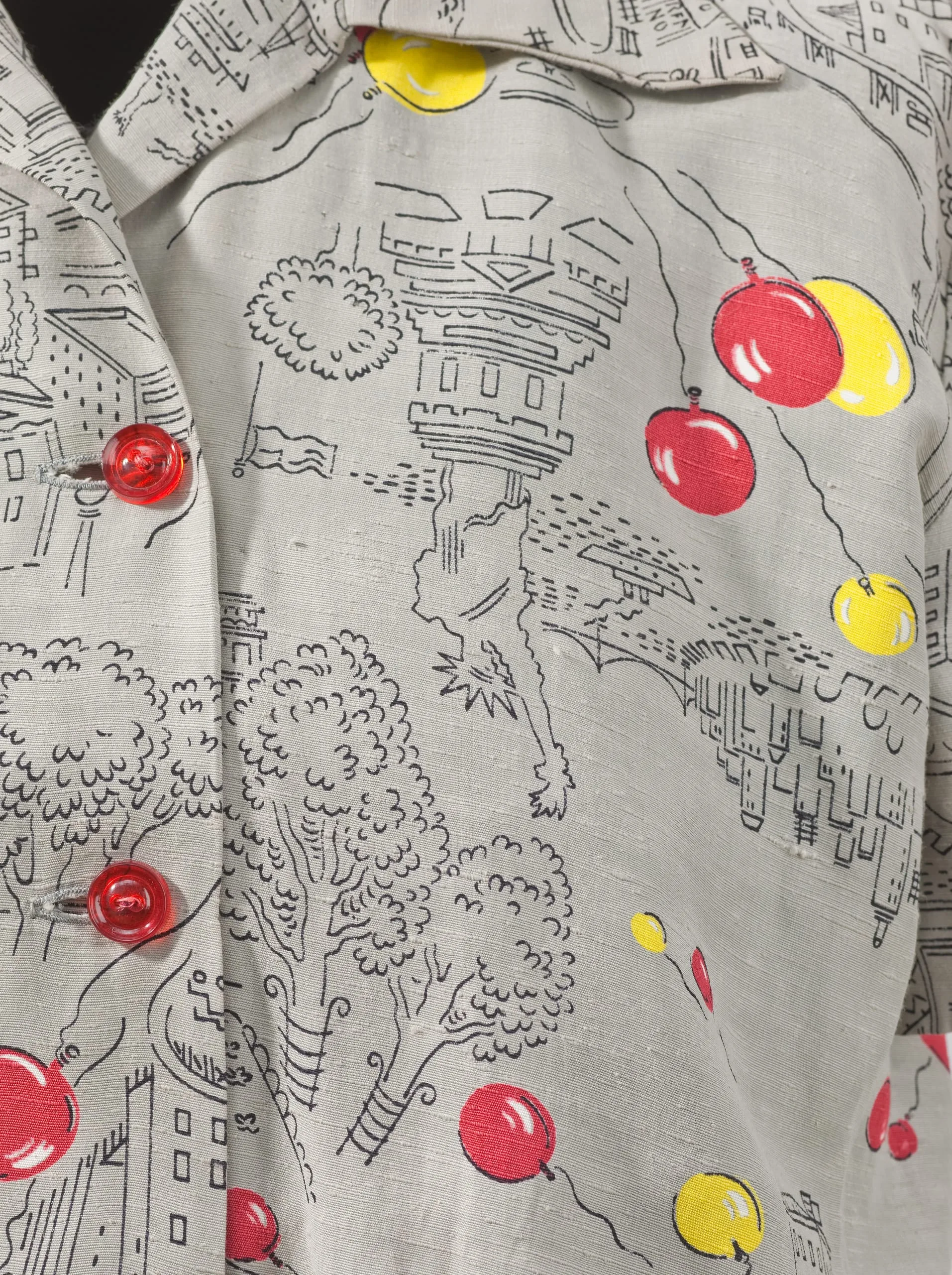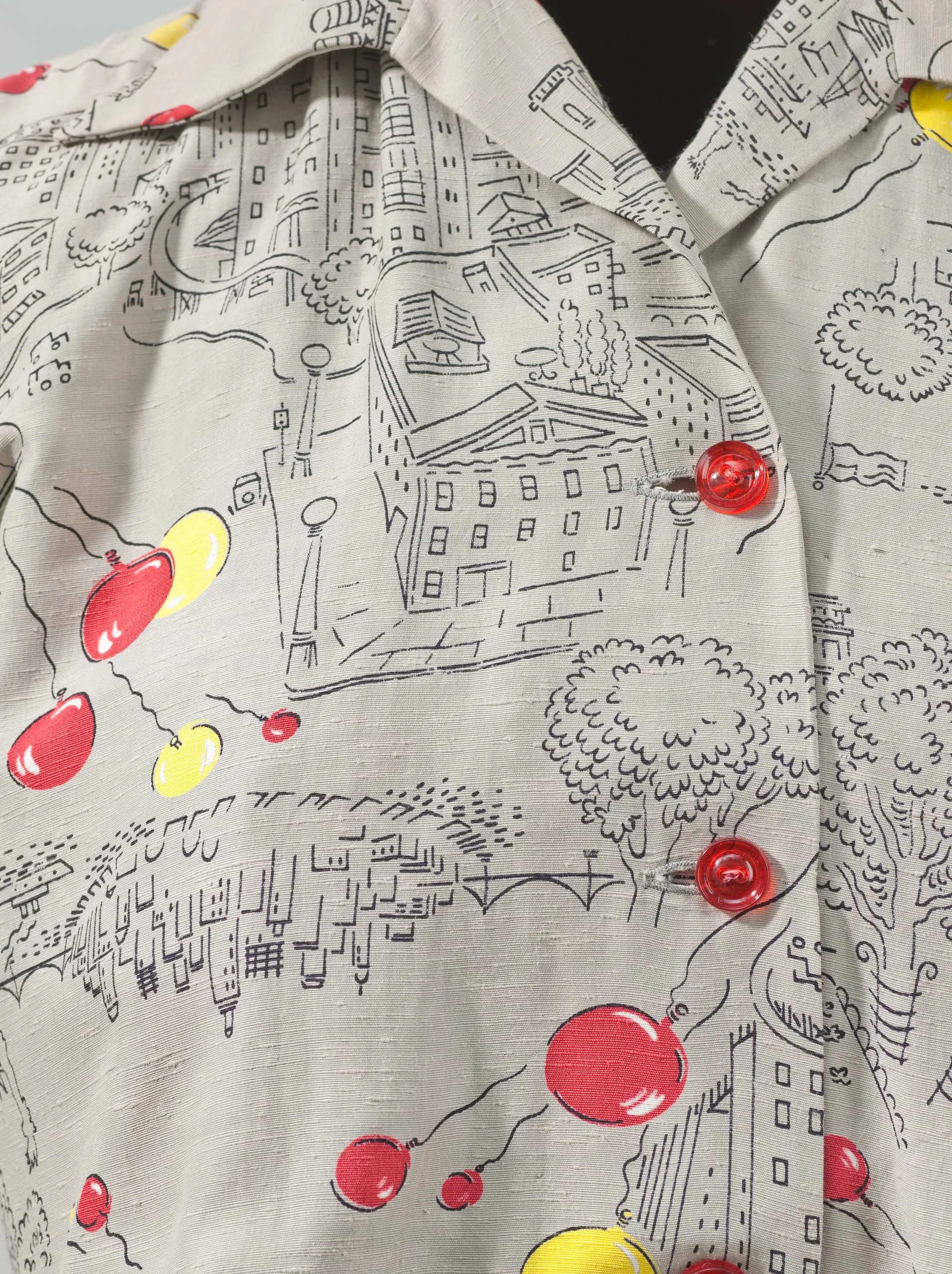 - Rayon/cotton plain weave, printed, with plastic buttons.