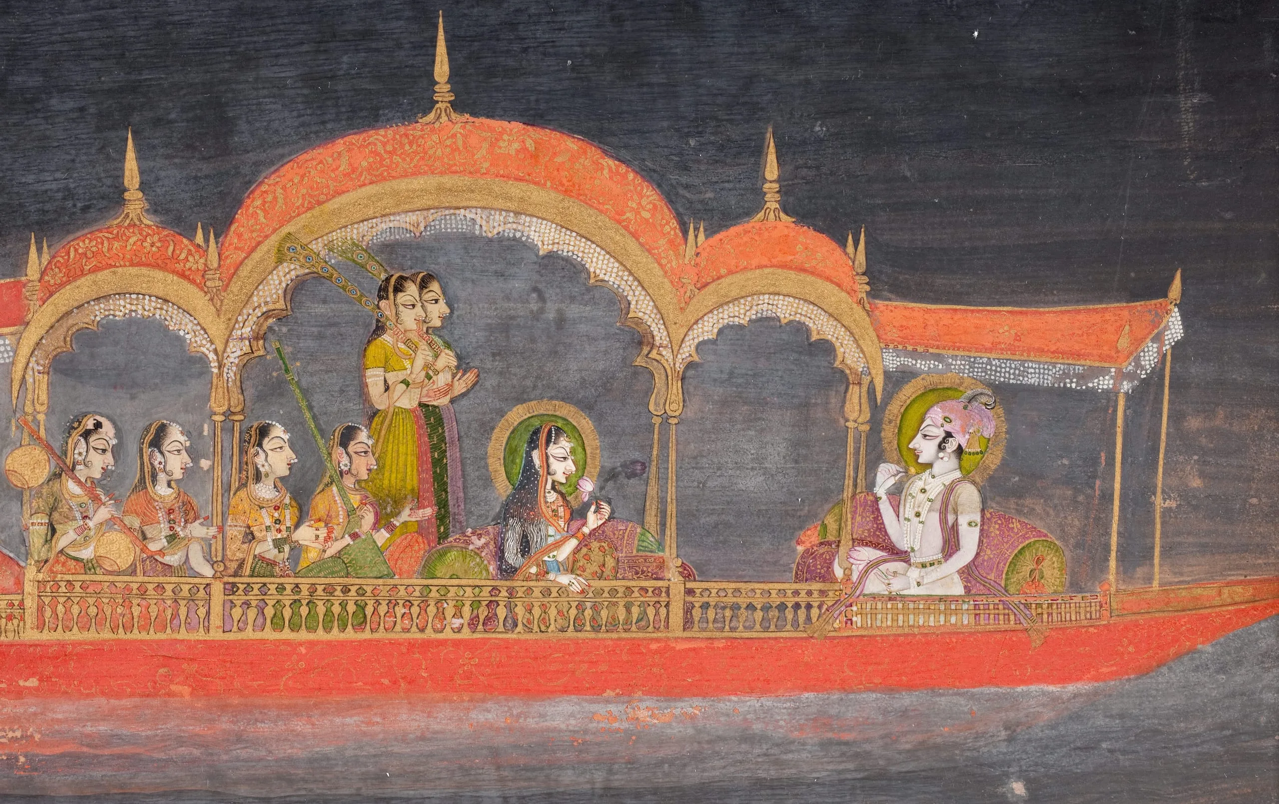 This large painting depicts the Kishangarh ruler Savant Singh (r. 1748-57) and his beloved courtesan Bani Thani cruising on Lake Gundalao in the royal barge on a moonlit night accompanied by female musicians and attendants with the Kishangarh palace and gardens shown in the background. The distinctive aquiline profiles and exaggerated almond-shaped eyes of the delicately portrayed royal couple are a hallmark of Kishangarh painting of this period.