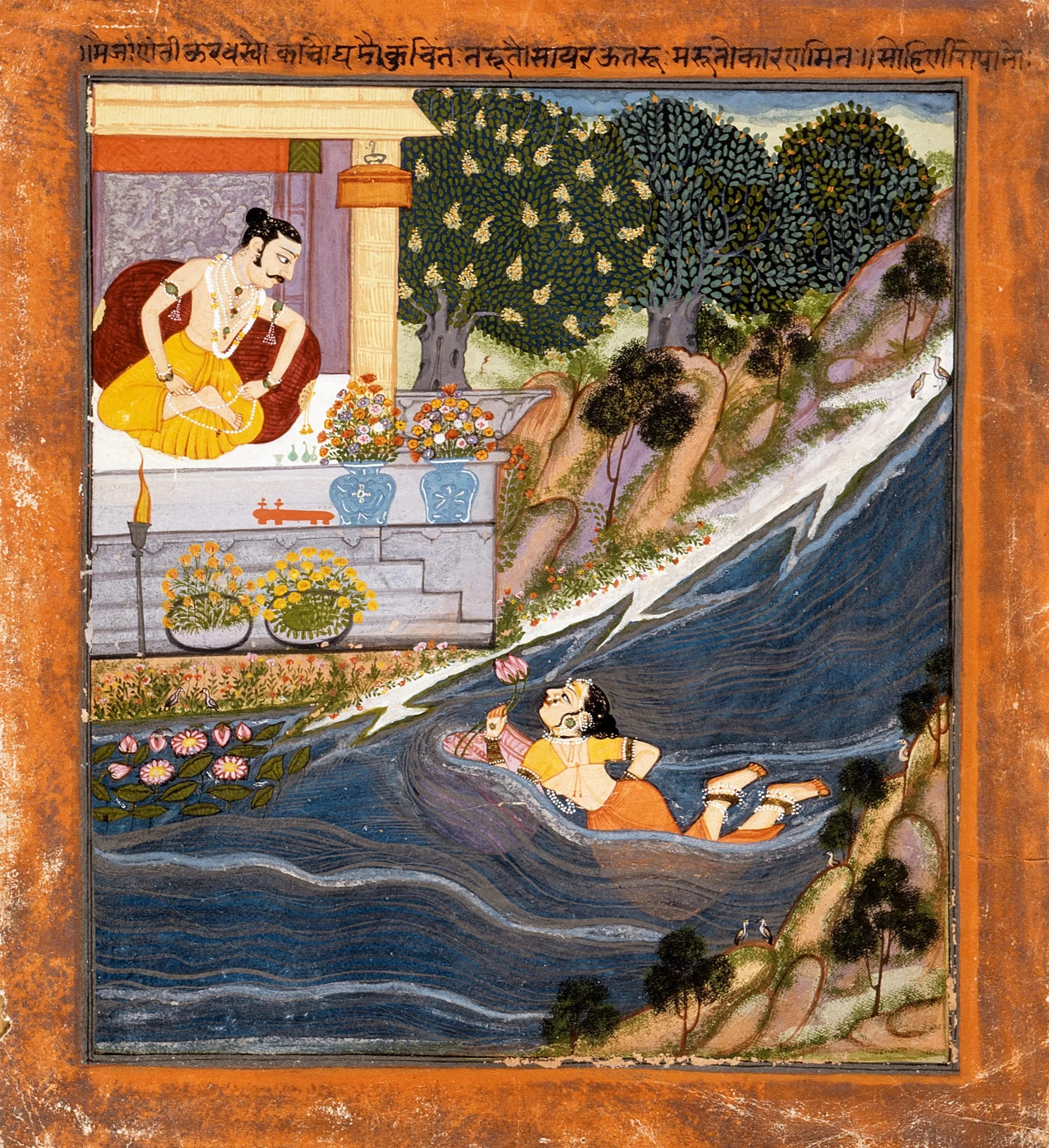 Sohni floats on the overturned pot for her tryst with Mahinwal, who is unusually portrayed as a nobleman in a bedchamber pavilion. The inscription states, "In using the unbaked small pot kept under the tree [when Sohni would] descend into the river, thus would be the cause of her death. A leaf from Sohani [Sohni]." (Translation by Naval Krishna.) See also M.72.2.1.