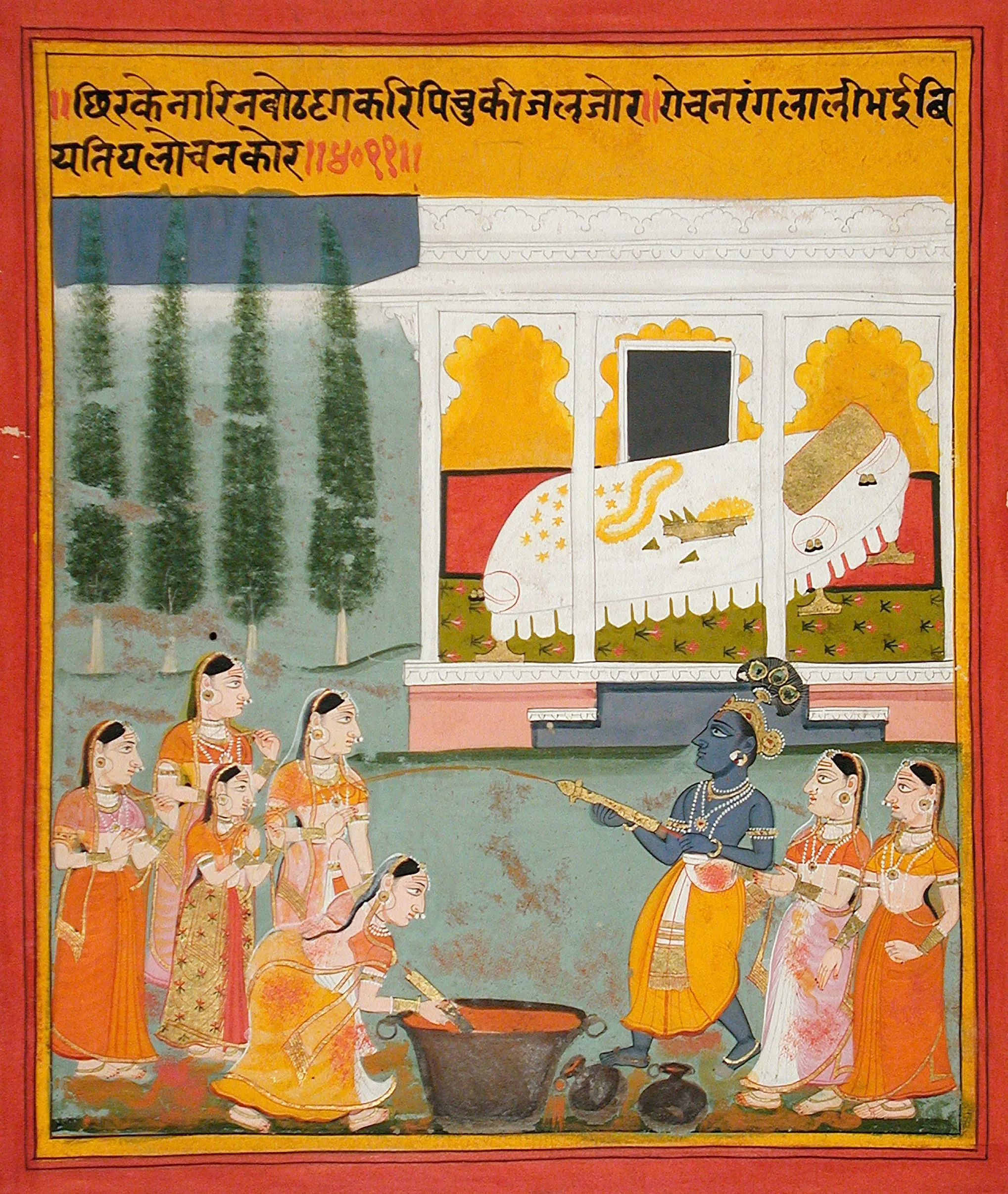 Here, the blue-skinned Krishna shoots a stream of red water with a large syringe onto a group of gopis (herdswomen). Another gopi is refilling her syringe from a large vat of red oblations. Krishna and the gopis are covered with red water stains. In a palace bedchamber behind them a king-size bed prepared with cushions, garlands, and pan (betelnut quids) symbolizes their ensuing rapturous tryst. The header is inscribed with poetic verses, which have yet to be translated. See also M.76.149.2, M.79.252.7, and M.81.280.2.