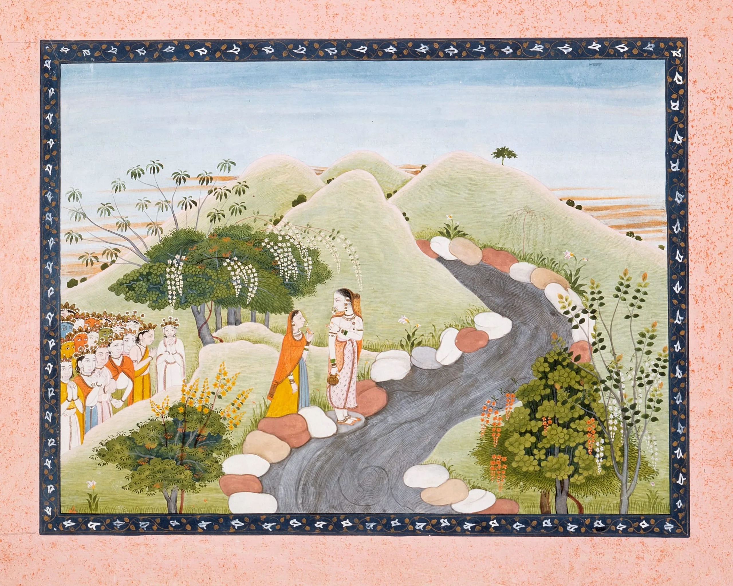 This painting illustrates a tale from the final episode (Chapters 5-13) in which various male gods, shown in reverential postures on the left, were afflicted by two demonic brothers, Shumbha and Nishumbha. Unable to defeat them, the gods offered a hymn to the Devi Parvati (the highest form of the Goddess) in the hope that she would come to their aid. Parvati, portrayed standing on the riverbank in an orange shawl, did not know to whom the hymn was addressed. In answer to her confusion, an auspicious towering form arose from the sheath of her own body and proceeded to destroy the demons. Imbued with cosmic energy (shakti), this form of the goddess was known as Kaushiki. She is depicted standing above Parvati in a graceful aspect and holding an ascetic’s waterpot. Another rendition of this figural composition, albeit with a variant landscape, is in the Lahore Museum (E.12).