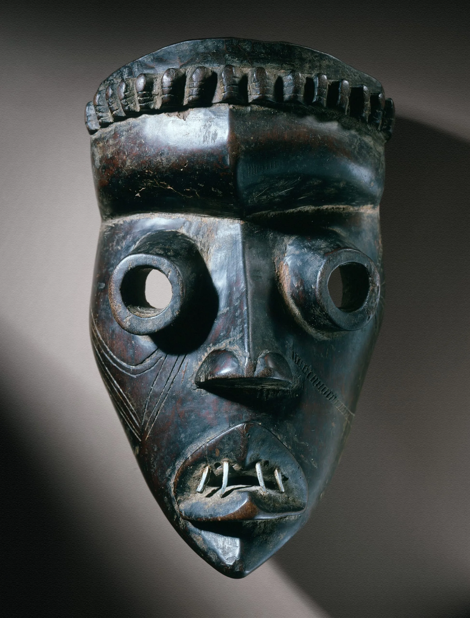 Carved wooden face mask with deep black patina, cylindrical eye sockets, serrated top edge, and white tooth inserts set into the open mouth
