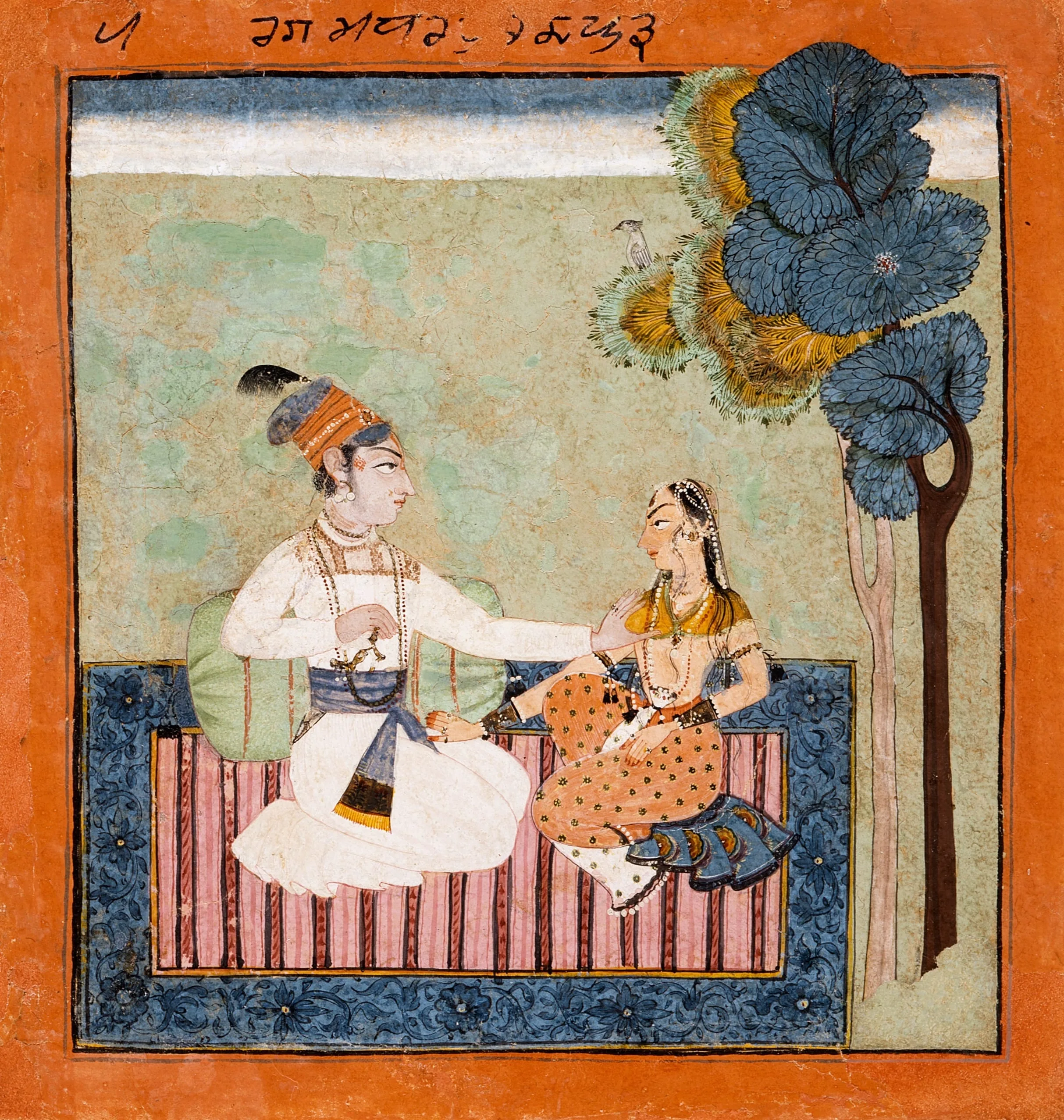 The Takri inscription of the border above this painting states it to be Madhu Ragaputra, a son of Bhairava Raga. According to Kshemakarna’s system of classification, the protagonist is described as a handsome and fair man, knowledgeable, skilled in the arts, and frequently dressed in red (verse 20). Here, however, as in most representations of the melody in the Himachal Pradesh or Pahari tradition, the hero is shown in white and fondling his beloved’s breast. They are seated outdoors on a carpet in the shade of an overhanging tree. Alternatively, the couple are depicted as drinking, with or without a female attendant.